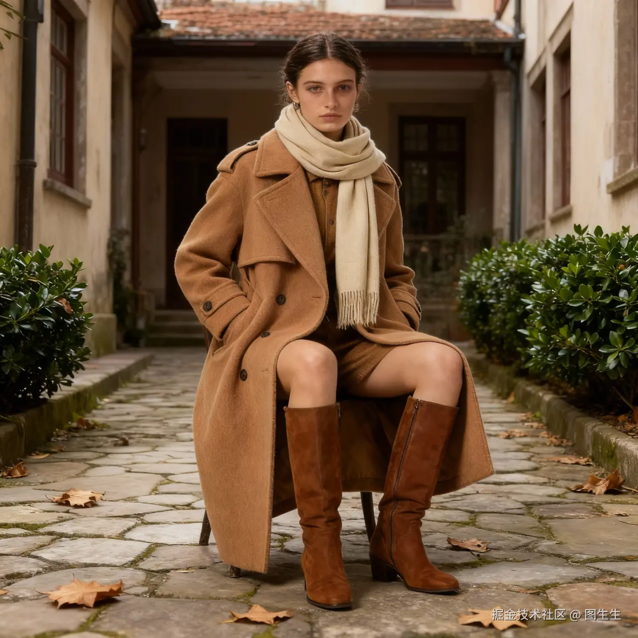 保留模特所穿驼色复古毛呢大衣、米色围巾、棕色长靴不变,保持坐姿,双手插兜,背景替换为老洋房庭院,地面铺有石板路,散落几片枯叶,墙角有绿色冬青