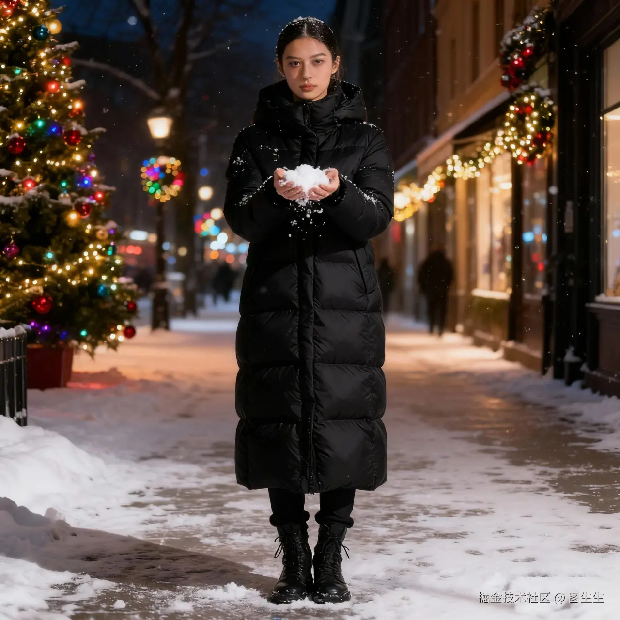 保持模特服饰样式和材质不变,双手捧雪,背景替换为冬日落雪街头,地面有薄薄积雪,路边有挂着彩灯的圣诞树