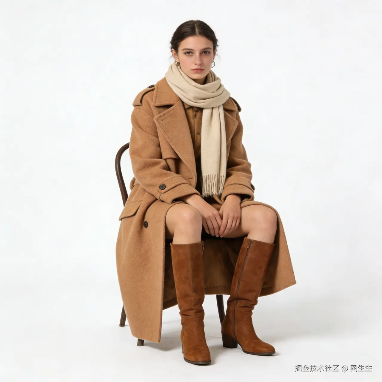 模特坐姿端正,身着驼色复古毛呢大衣,搭配米色围巾和棕色长靴,背景为纯白底色。