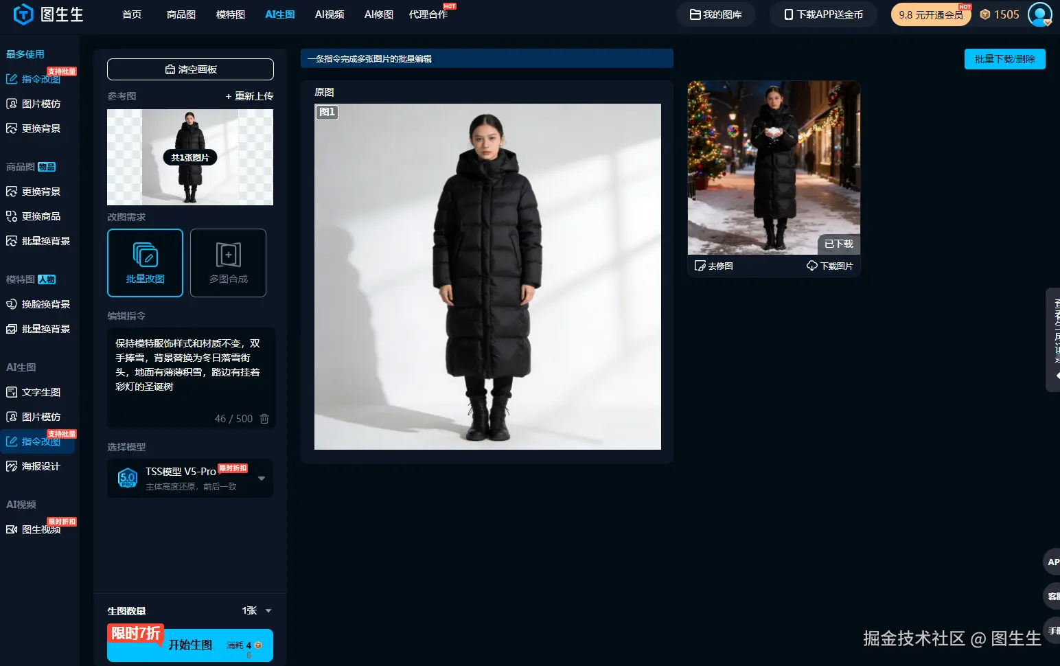 用AI指令改图,上传白底模特图,输指令就能换场景姿势,服饰细节1:1还原,十几秒出图可批量,商用无忧,电商人冬季上新神器!