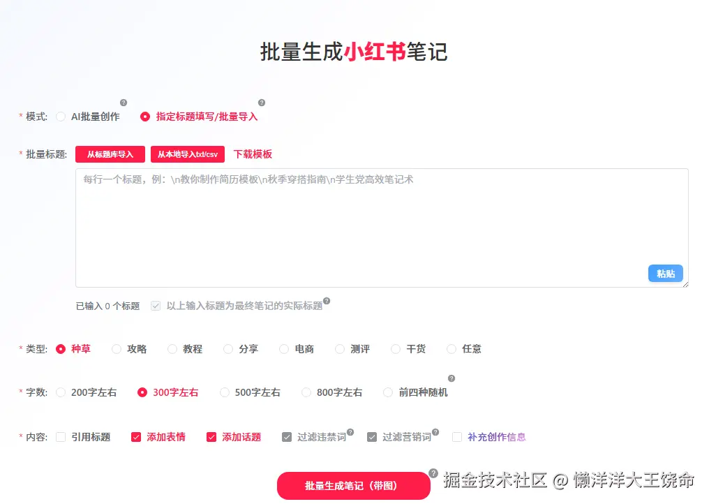 ・批量生成差异化内容: 基于采集到的爆款逻辑,用火兔工具箱的一键生成功能,输入核心主题和风格要求,就能批量产出不同角度的内容初稿。关键是它自带海量模板选择,能根据不同平台(公众号、小红书、抖音)的风格调整内容结构,避免生成内容千篇一律。