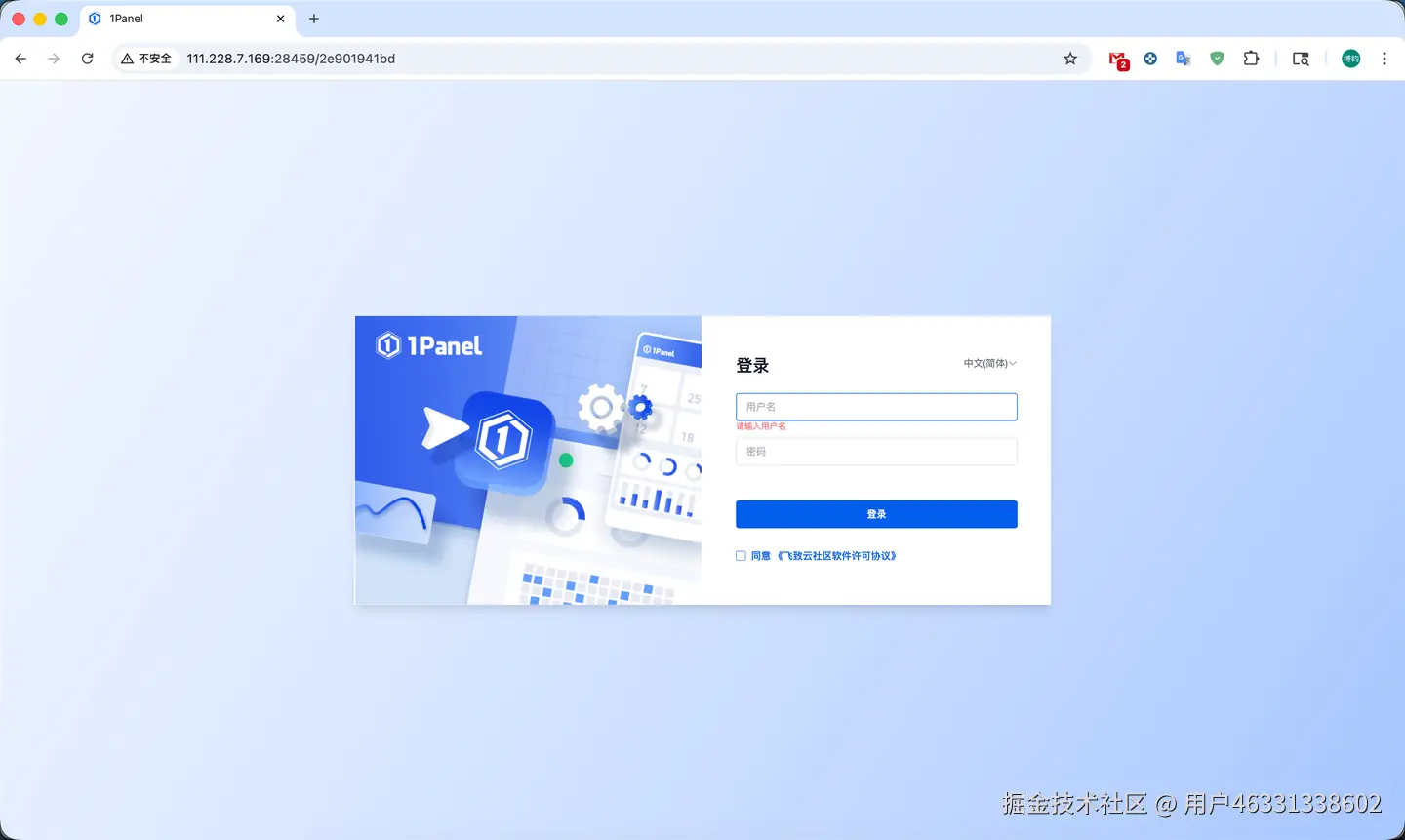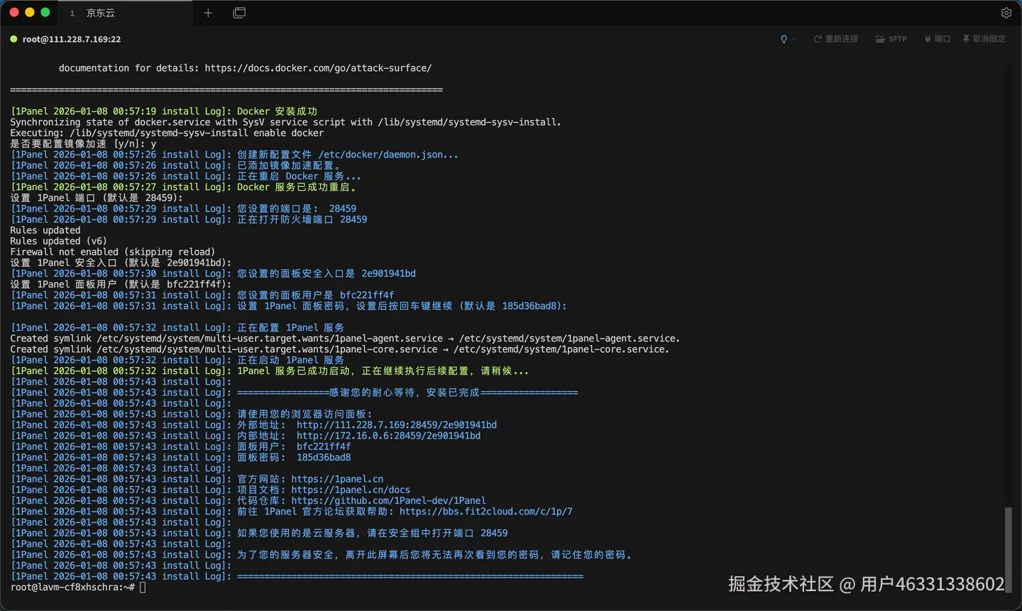 安装完成后,终端会显示面板的 访问地址、用户名和密码。请在浏览器登录并进入面板。