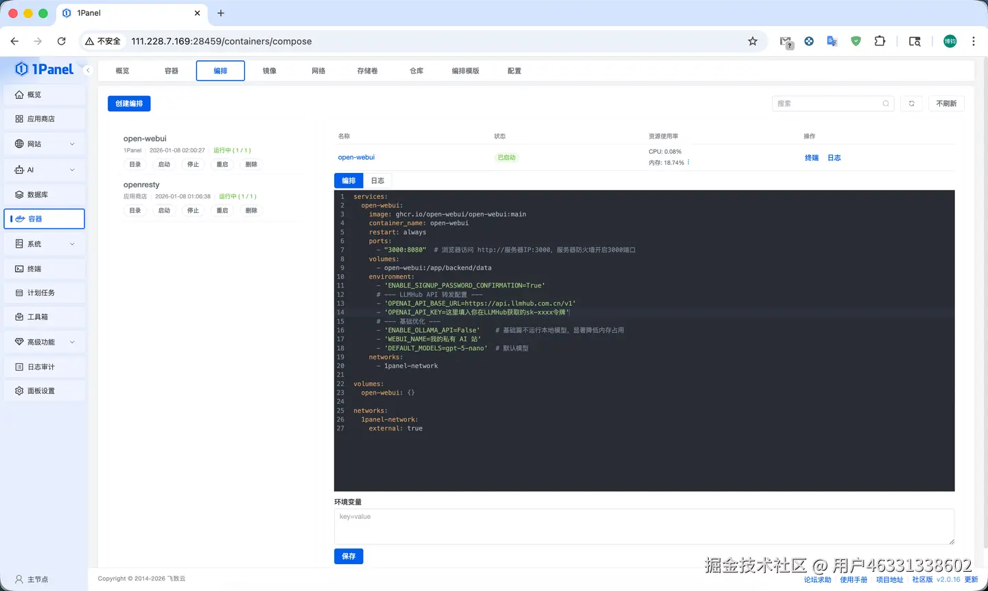 - 自动重启:1Panel 会确保你的 AI 站 7x24 小时在线,即便服务器重启,容器也会自动拉起。