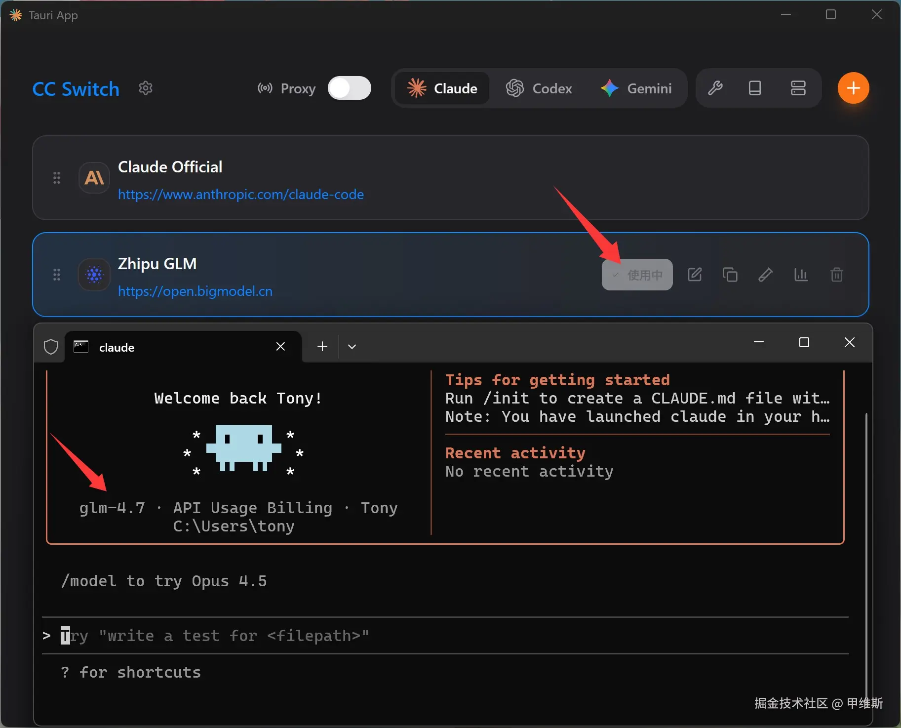 比如你要测试 Zhipu GLM ,那么就在这一条上点击使用,然后在终端输入 claude 启动 CC。