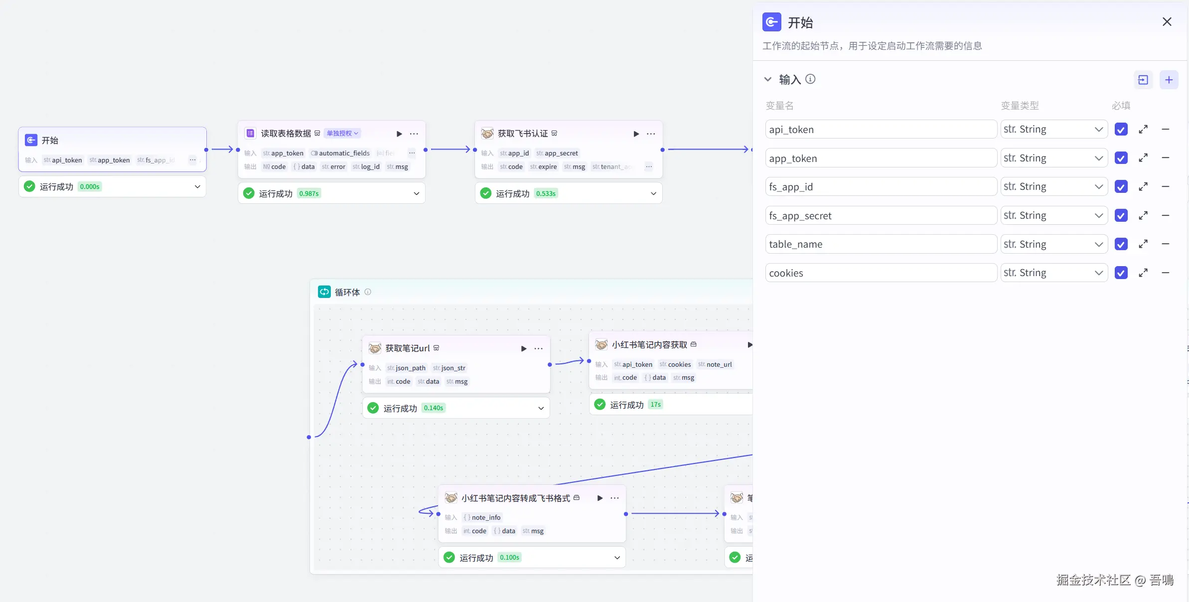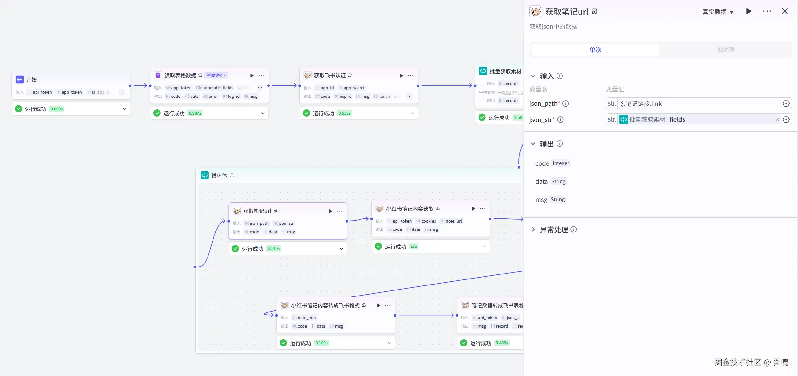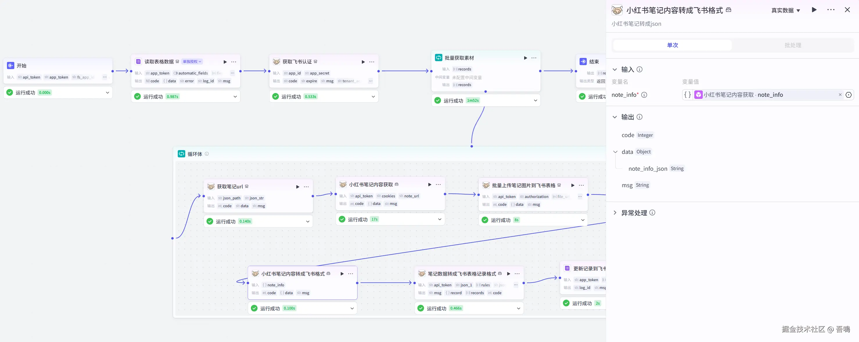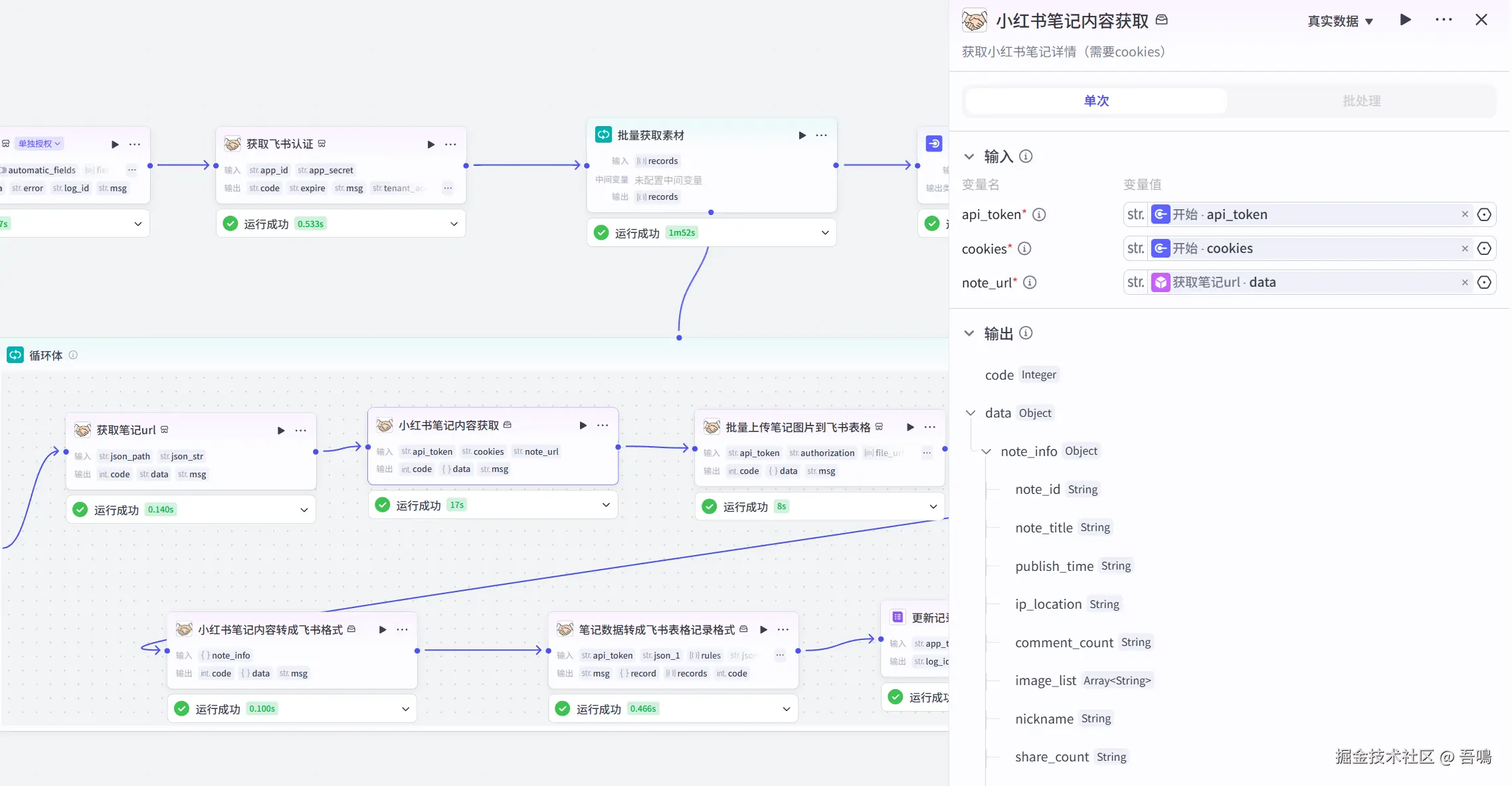 这个节点使用到了扣子官方的循环节点,用来循环获取小红书笔记内容。
