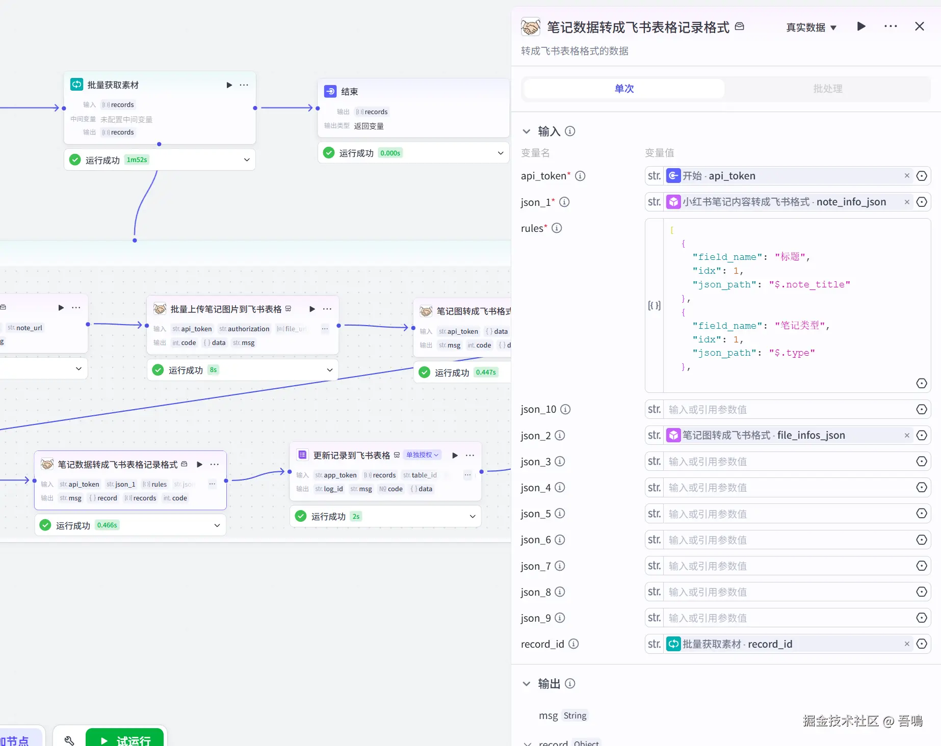 这个节点用来把采集到的笔记图片上传到飞书多维表格中,以便可以当作表格的附件直接浏览,无需跳转,使用到了扣子的三方插件【飞书工具箱】的【batch_upload_mdedias】工具。