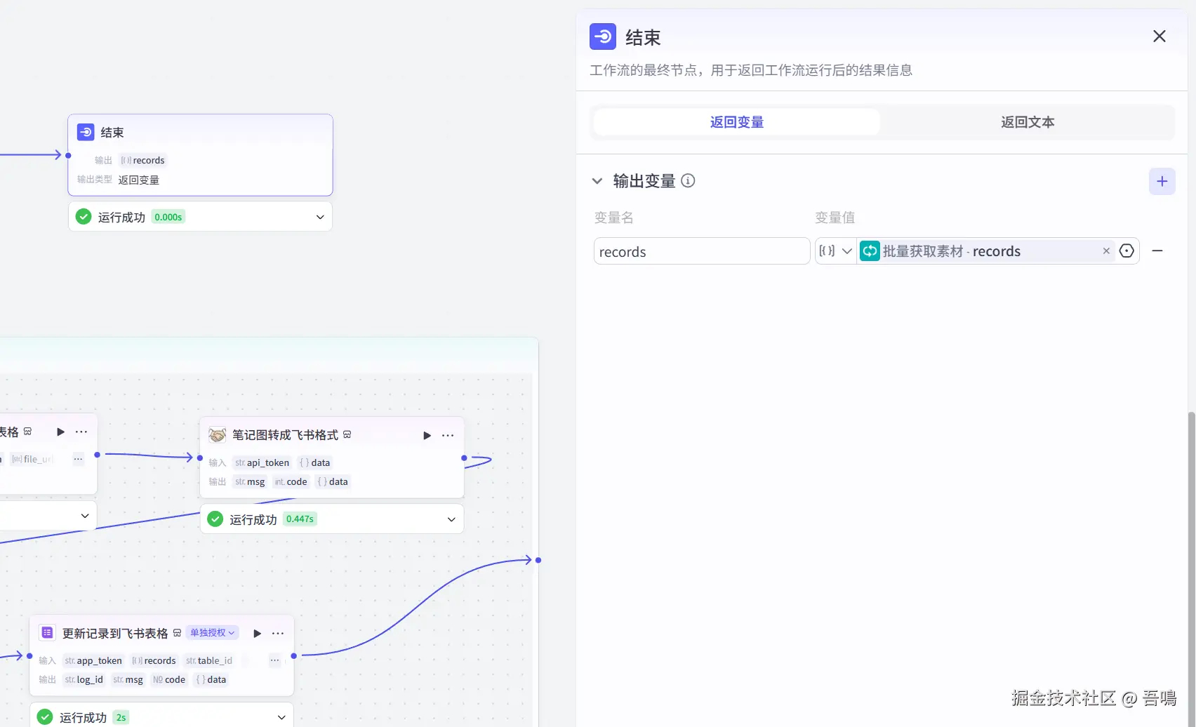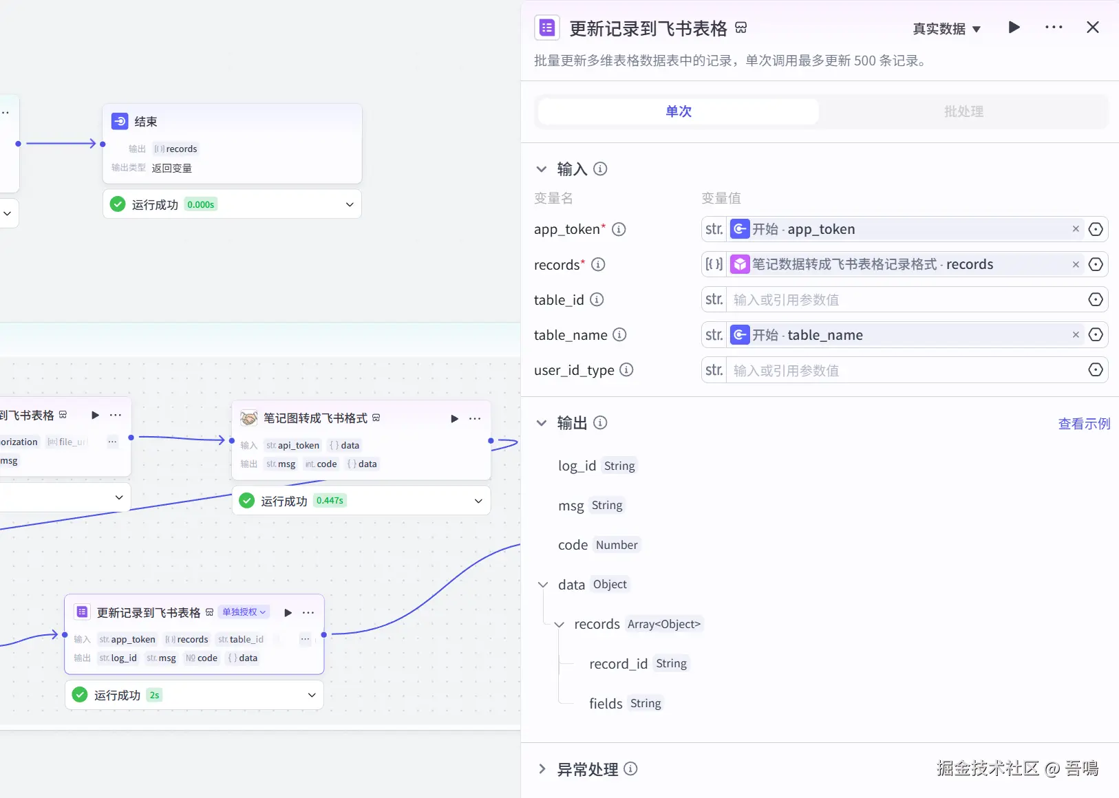 这个节点的作用是把数据更新回飞书表格中,使用到了扣子官方插件【飞书多维表格】的【update_records】工具。