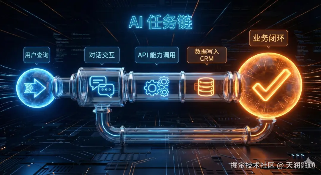 任务确定之后,才再向下拆解——需要采集哪些信息、调用哪些接口、结果写入哪个系统、如何形成流程闭环。换句话说,对话只是任务路径中的一个环节,而不是任务本身;只有当任务被清晰设计出来,流程能力才可能真正跑通。