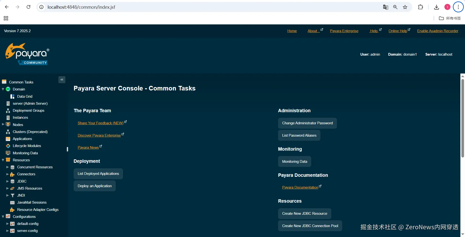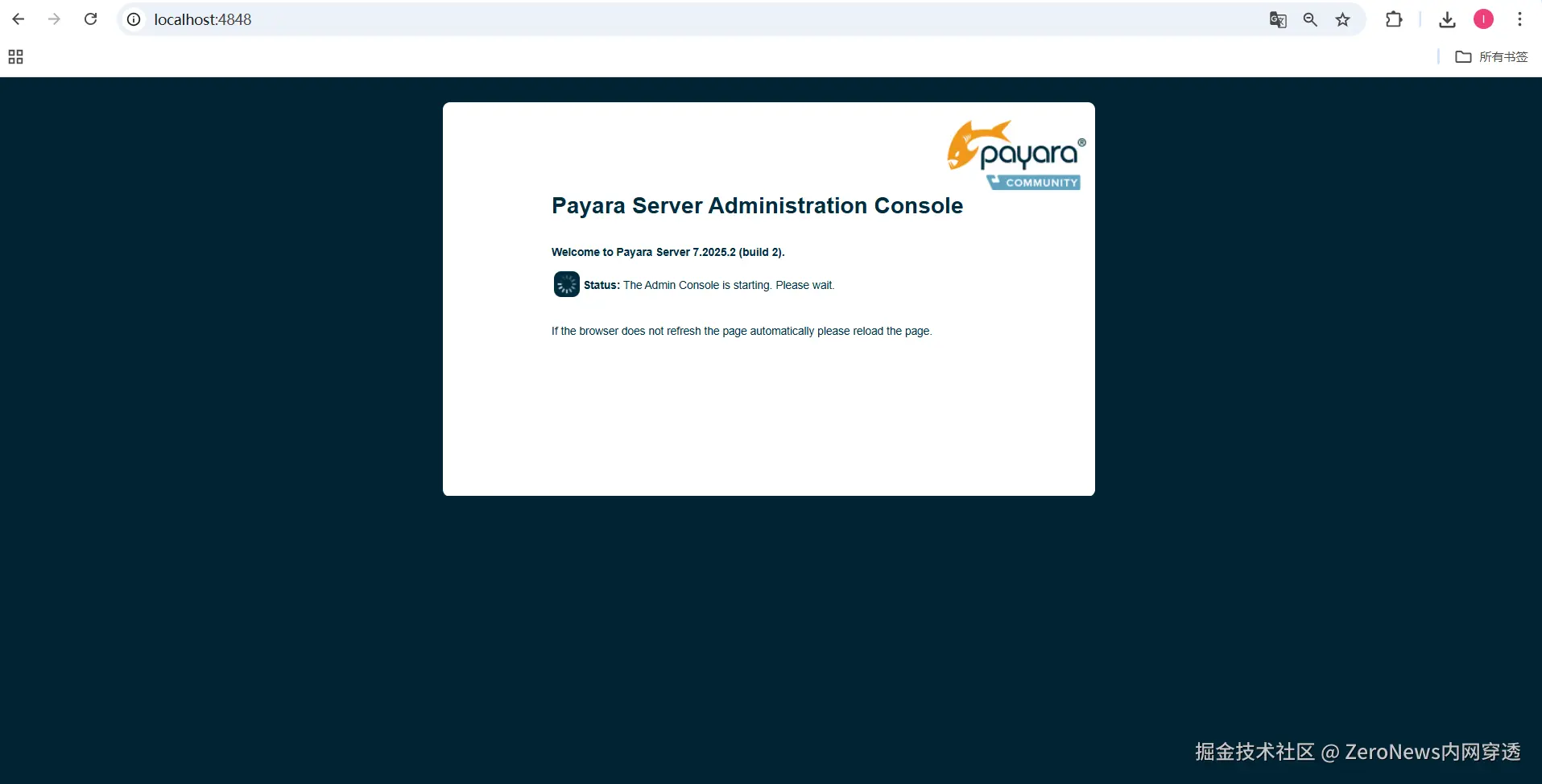 8. 启动完成之后,就可以看到提示 Admin Port:4848,这时候,我们在浏览器输入localhost:4848,就可以进入到web管理页面了。