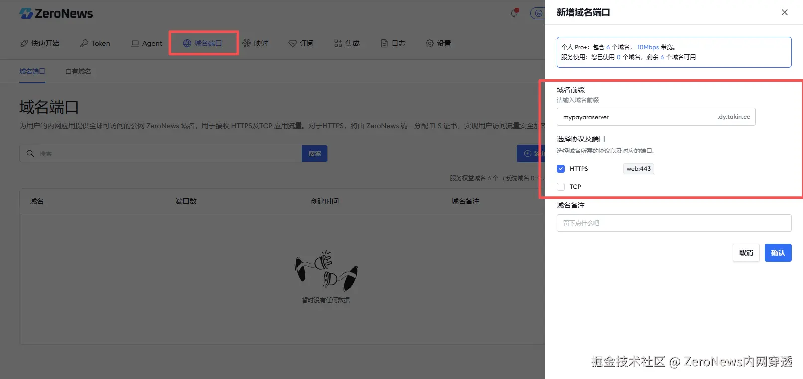 2、 接着,我们在域名端口页面,创建一个可用的公网域名(自定义前缀),并勾选HTTPS 协议端口。