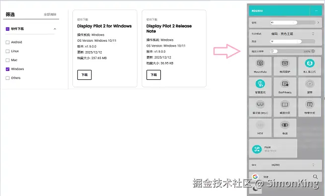 市面上显示屏的调节几乎都依赖于屏幕底部或者边上的物理按键,调节起来很不方便。而明基 RD280U搭载自研的Display Pilot 2软件,一键调试你需要的屏幕模式,化身编程小助理,轻松调整屏幕的模式。直接在官网下载匹配系统的安装包即可。