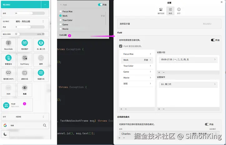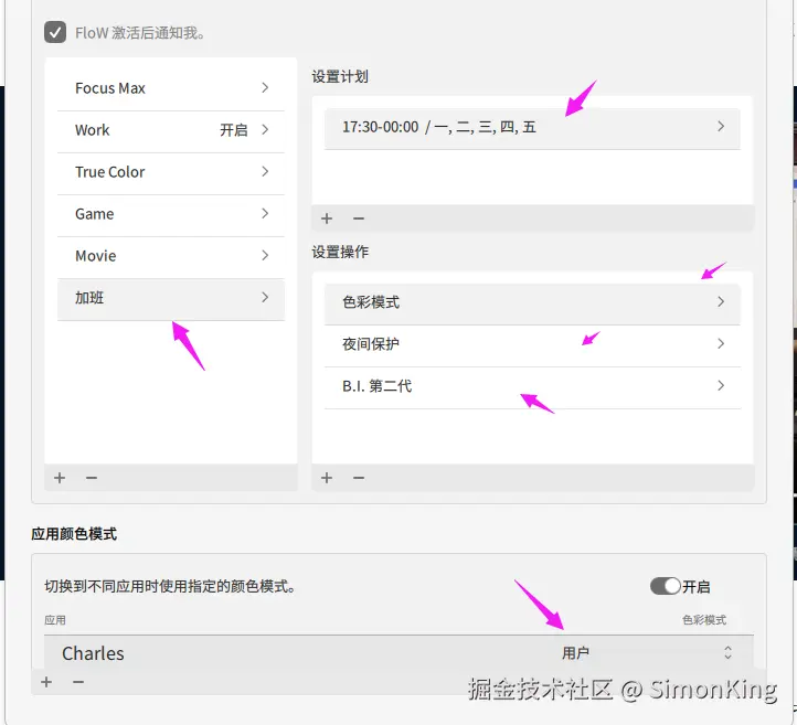 Flow功能就像工作流一样,设置时间计划,不同场景无缝切换,甚至可以根据不同的应用出发不同的主题。为了满足平时正常工作与加班的需要,分别可以设置工作模式和加班模式的无缝切换。