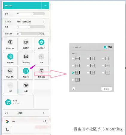 如果说酷呆软件的分区帮助我们归类了文件图标,那么这款「明基 RD280U」显示屏的桌面分区可以让我们像程序的多线程一样,开启不同的任务。