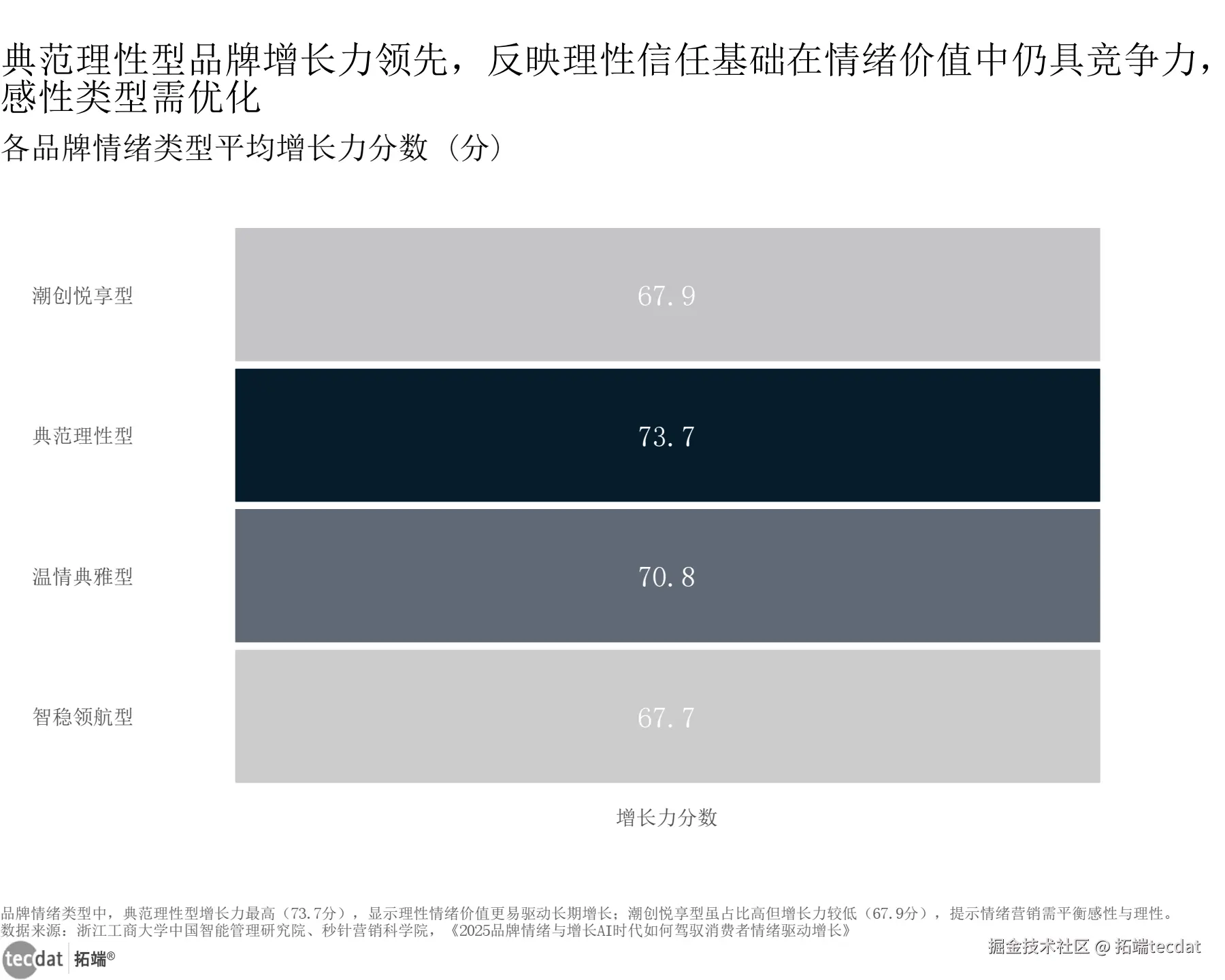 从增长力来看,典范理性型品牌以73.7分领跑,温情典雅型(70.8分)、潮创悦享型(67.9分)、智稳领航型(67.7分)紧随其后,表明理性情绪价值更易驱动长期增长,感性品牌需在情绪共鸣基础上强化理性支撑。