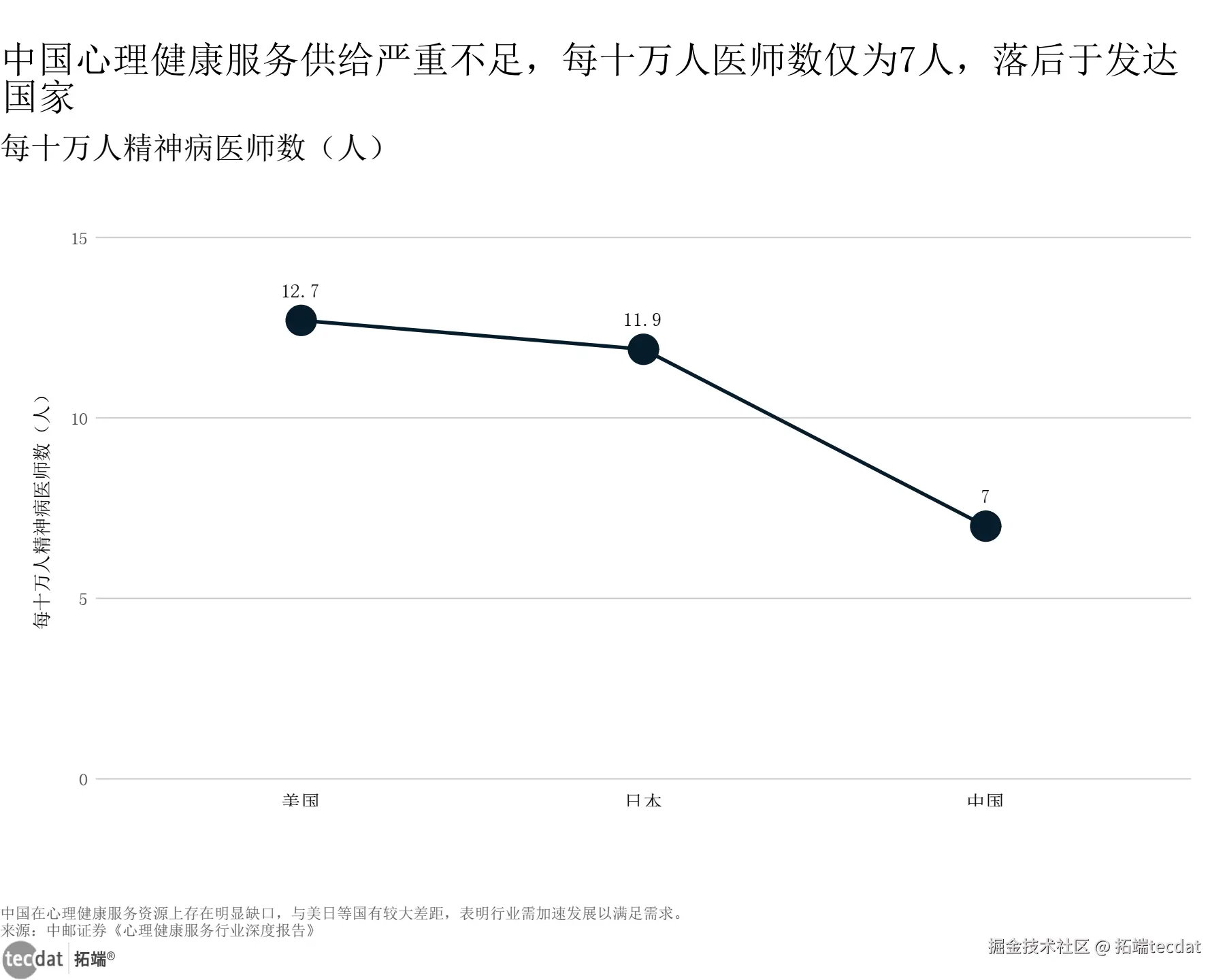 从消费结构来看,心理健康服务是最核心的增长引擎。预计2025年中国泛心理健康服务市场规模将达104.1亿元,2020-2025年复合增长率高达27%。但供给端的缺口同样显著:中国每十万人精神病医师数仅7人,远低于美国的12.7人和日本的11.9人,专业资源的稀缺性,正为行业创新提供了绝佳窗口期。