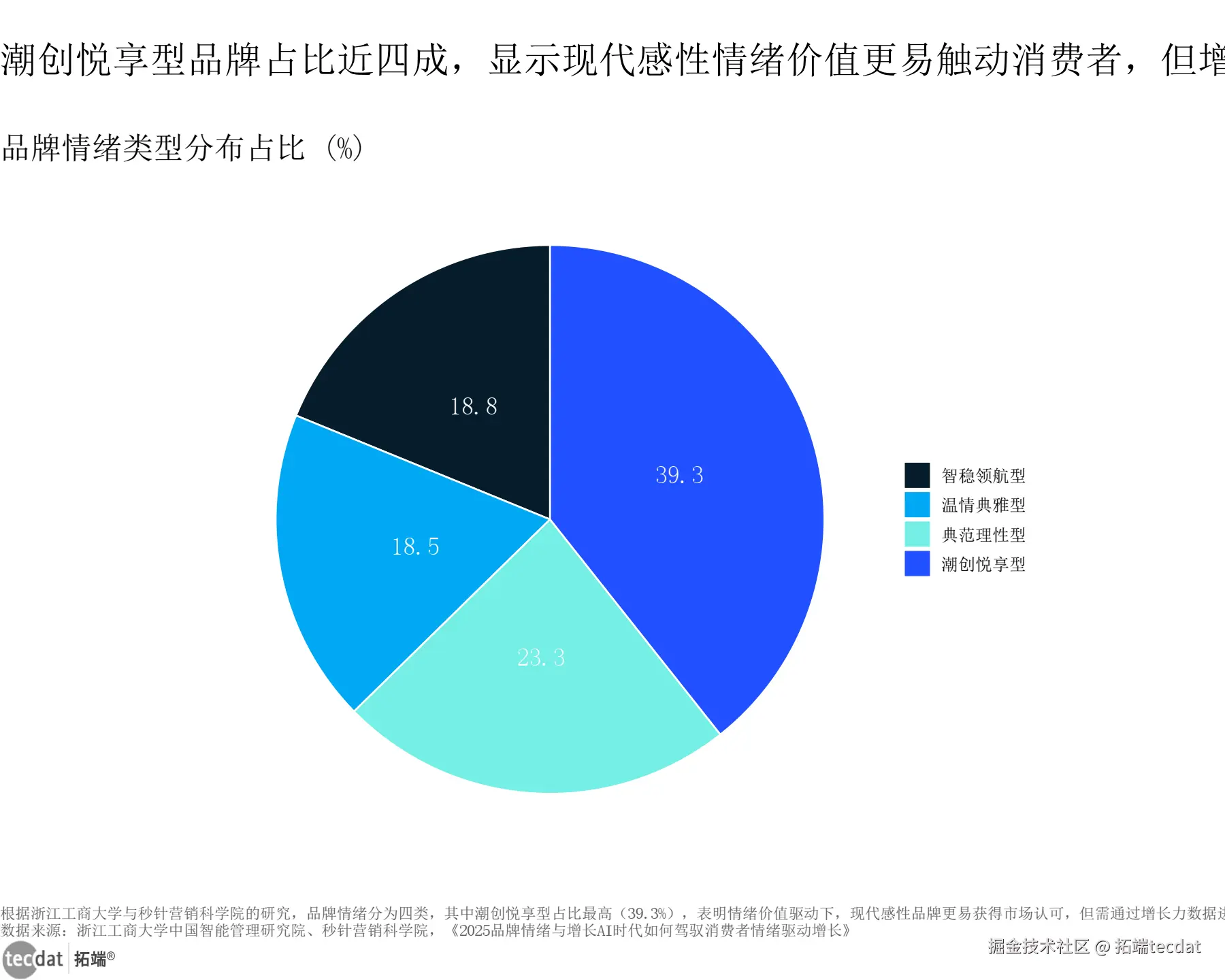 品牌情绪类型分布呈现多元化特征,潮创悦享型占比最高(39.3%),智稳领航型(18.8%)、温情典雅型(18.5%)、典范理性型(23.3%)均衡分布,反映出不同情绪定位的品牌均有其目标客群,其中现代感性类品牌更易获得市场关注。
