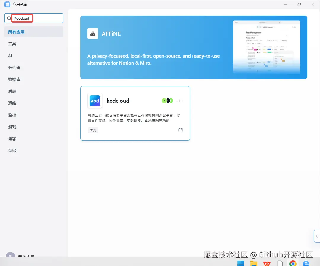 在商店的搜索框里输入 Kodcloud,点击出现的应用卡片进入详情页。