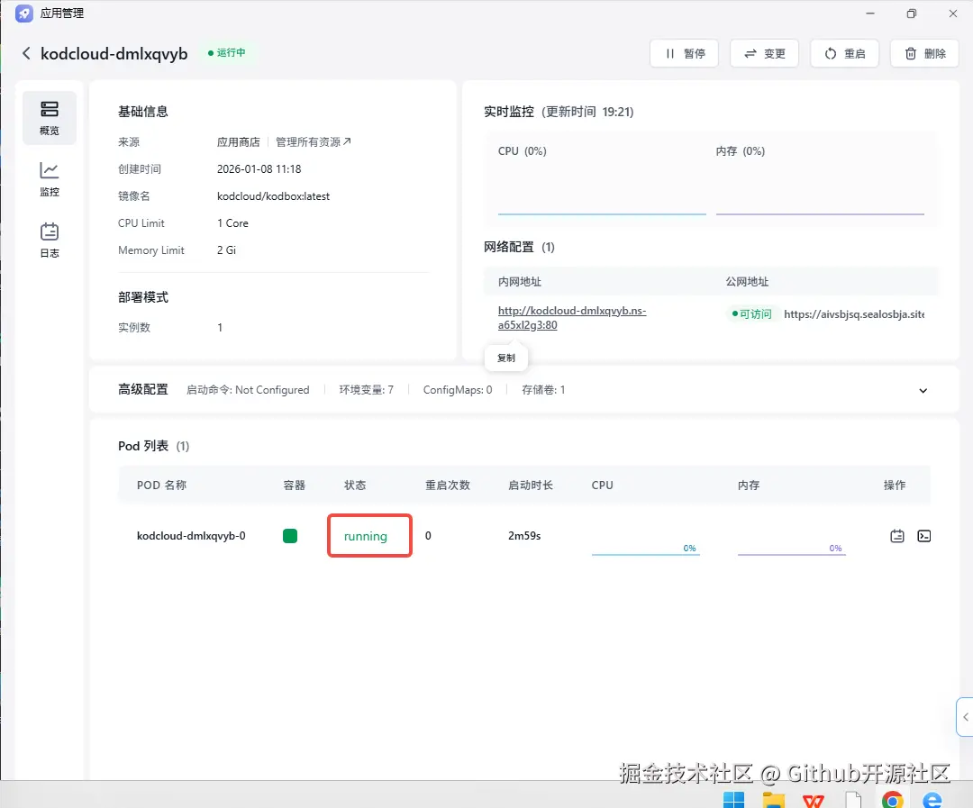 Sealos 会在后台自动完成所有环境配置和启动工作。大约等待 1-2分钟,当应用状态变为绿色的 Running 时,部署就完成了。此时,点击网络配置中的公网地址,你的私人云盘就已经可以访问了!