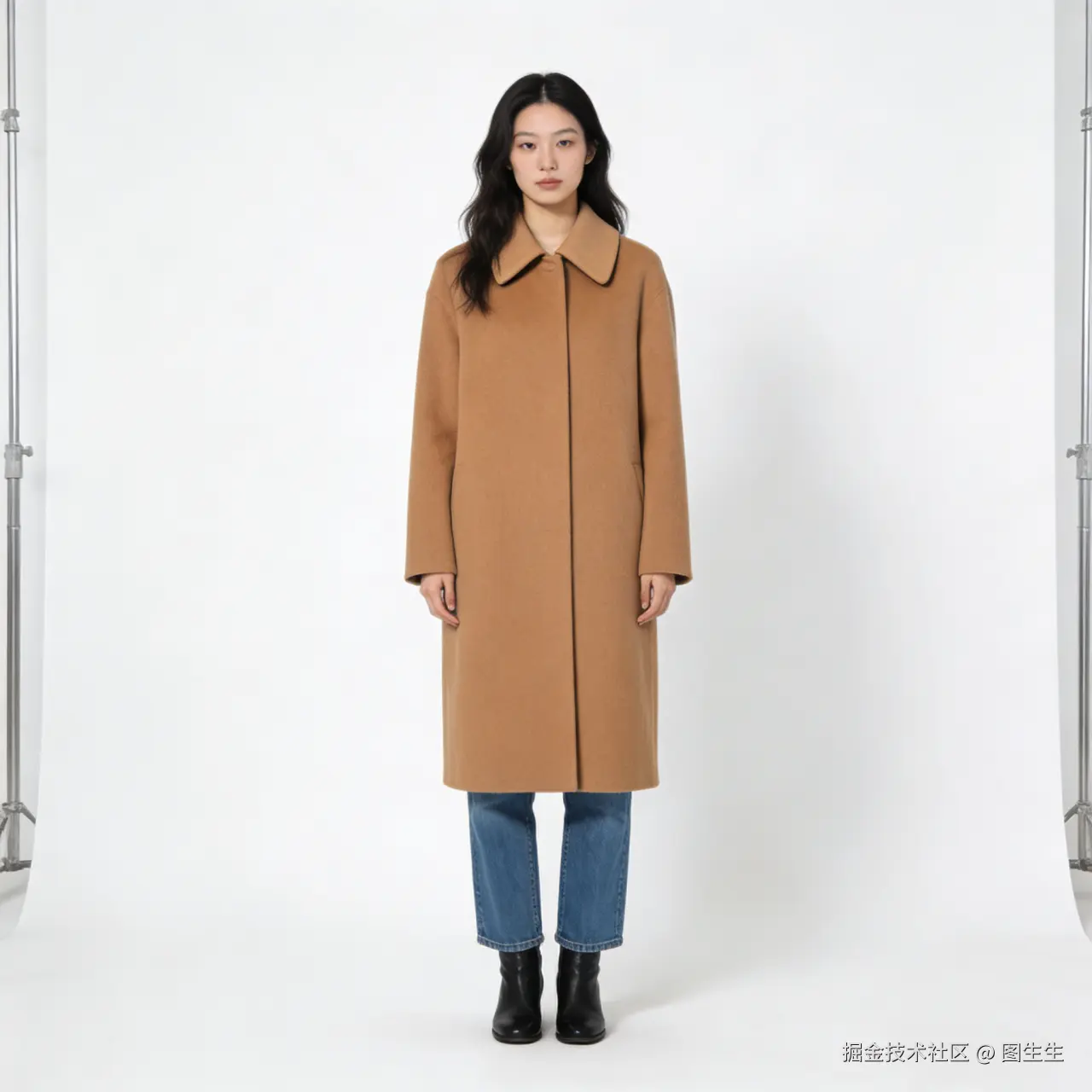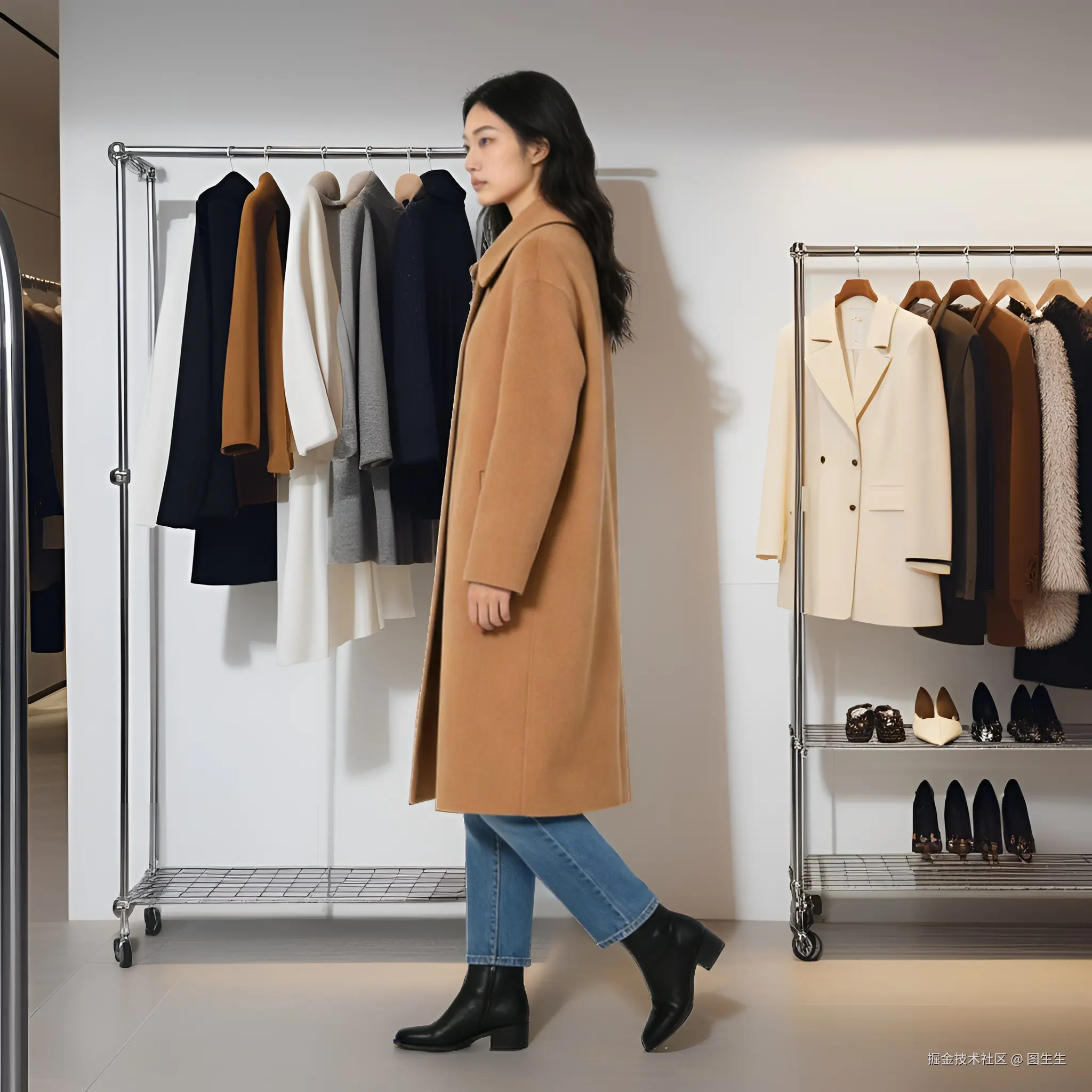 ✔【生成效果】:系统根据指令精准生成对应场景,自动将穿棕色大衣的模特融入其中,背景中零星行人增添生活气息,整体画面毫无违和感。