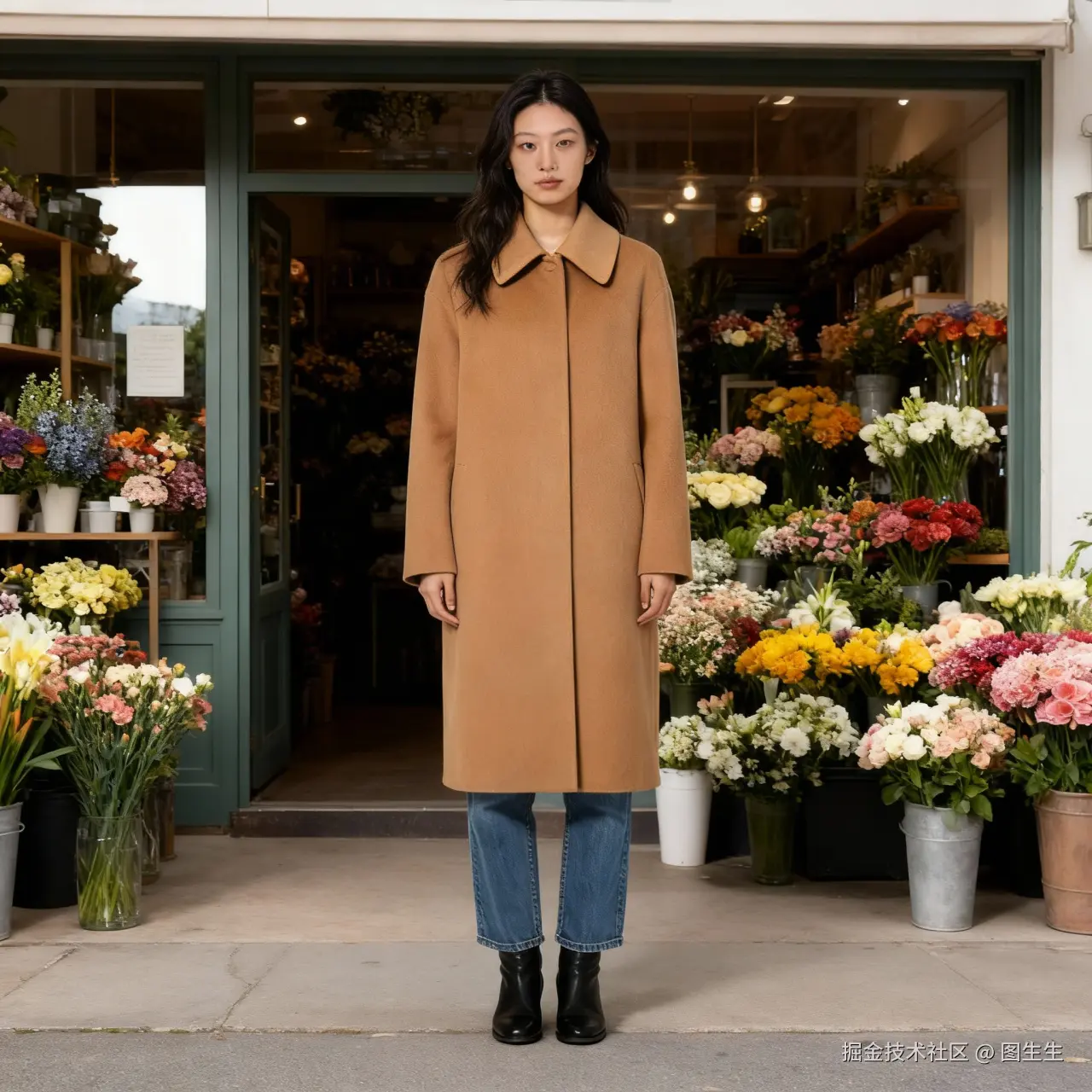 ✔【生成效果】:成片里的花店背景真实又细腻,整个画面充满了生机与浪漫。模特穿着大衣站在其中,营造出一种惬意的生活氛围。