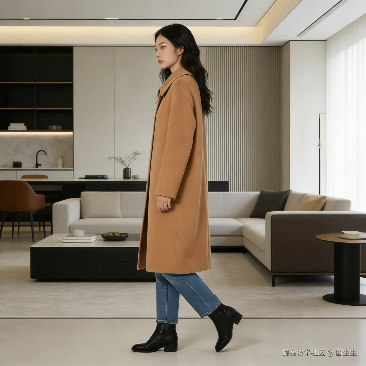 ✔【生成效果】:一键生成后效果直接惊艳,完美还原了大多数家庭的客厅环境。模特站在这样的背景里,仿佛就是消费者日常居家的样子,瞬间拉近了和用户的距离。