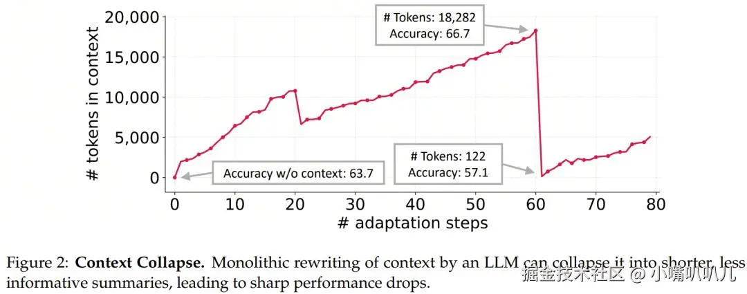- 「上下文塌缩」(context collapse):依赖 LLM 对整体提示进行重写的方式,往往会随着时间推移退化为更短、更模糊的摘要,从而造成性能骤降。