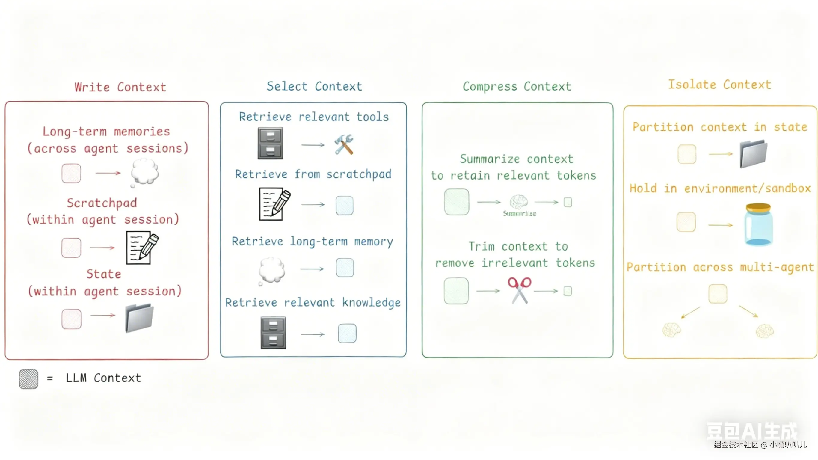 对上下文进行智能的、动态的写入(Write)、选取(Select)、压缩(Compress)和隔离(Isolate)