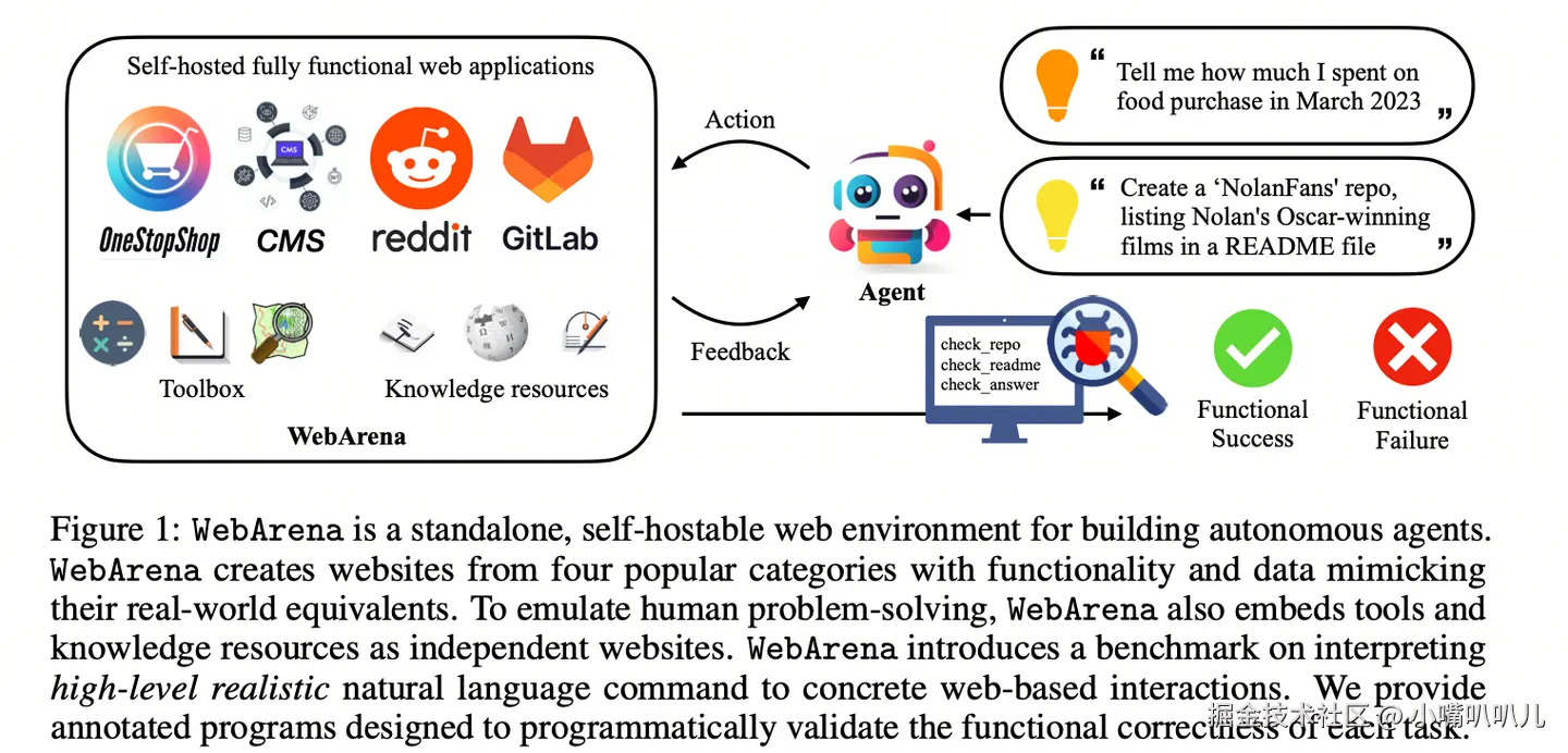 WebArena 考设计了四种常见场景,包括在线购物(Amazon、eBay),讨论论坛(Reddit、StackExchange),协作开发(GitLab),商业内容管理(CMS),并且纳入一些常用工具,比如计算器、地图、便签本,还有如维基百科这类常用知识库和文档。