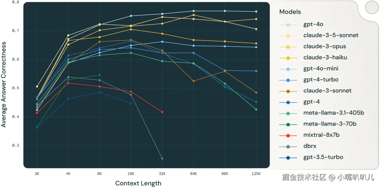 Databrick 的一项报告指出【7】,大多数模型的准确性在达到一定上下文规模后就会下降。例如:Llama-3.1-405b 的性能在 16k 个Token后开始下降,GPT-4-turbo 的性能在 64k Token后开始下降,只有少数模型能够在所有数据集上保持稳定的模型性能。