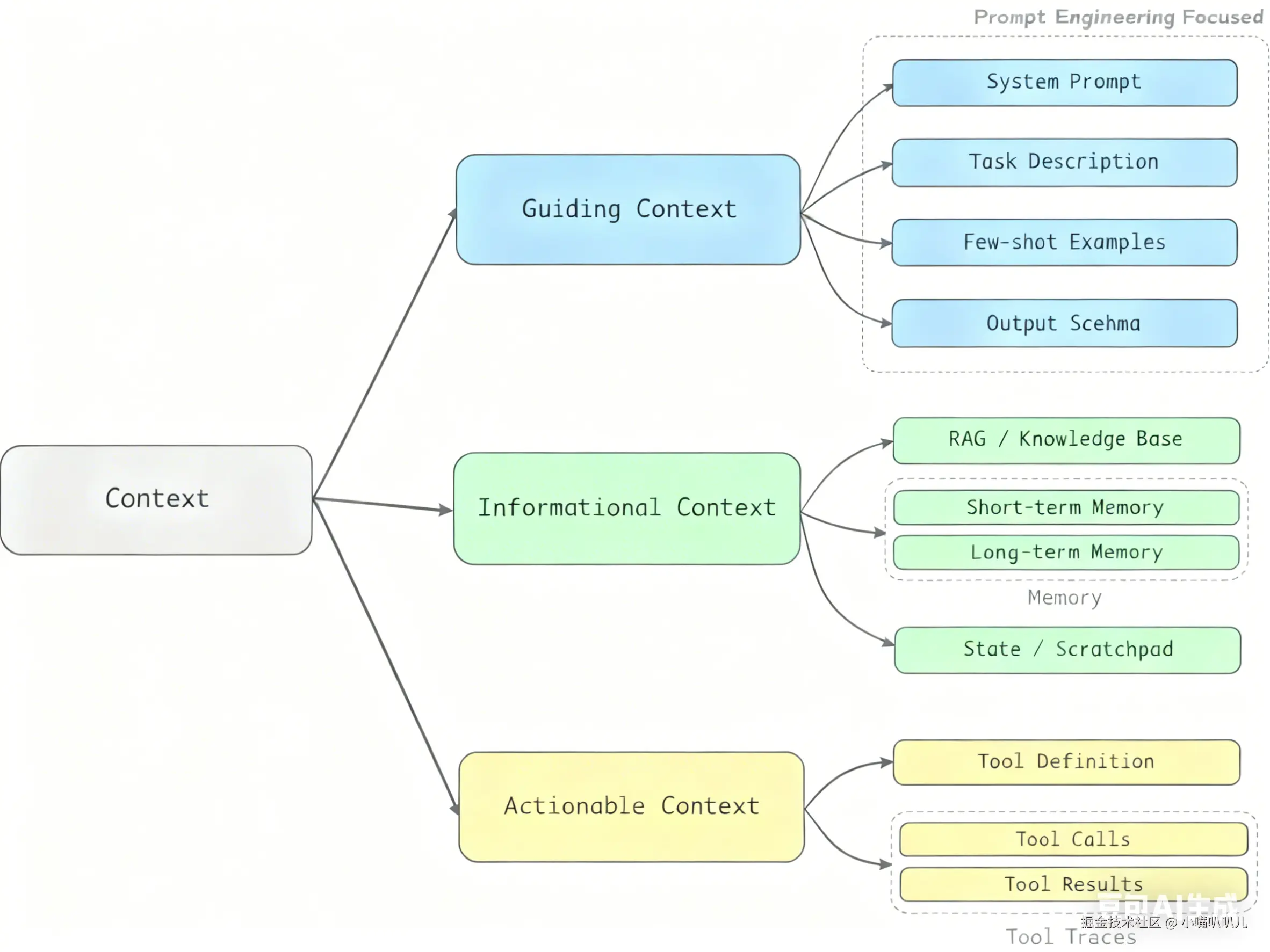 从本质上讲,上下文(Context)是提供给 LLM 用于完成下一步推理或生成任务的全部信息集合,按照信息的来源及类型可以大致分为三类。