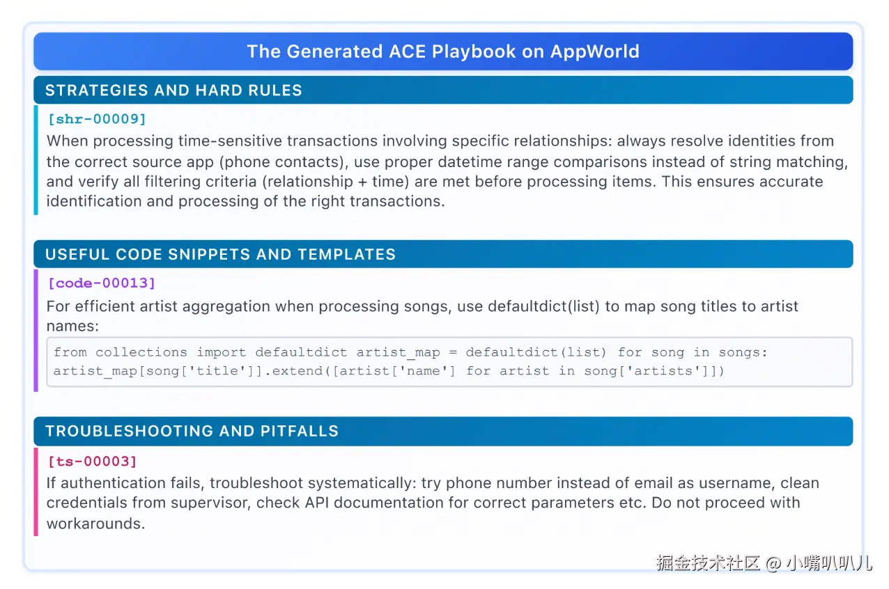 - 结构化内容:用于总结可重用策略、领域概念或常见故障模式等小单元。在解决新问题时,生成器会突出显示哪些提示有用或具有误导性,并提供反馈以指导反射器提出修正更新。这种方式既避免了整体重写的高计算成本与延迟。
