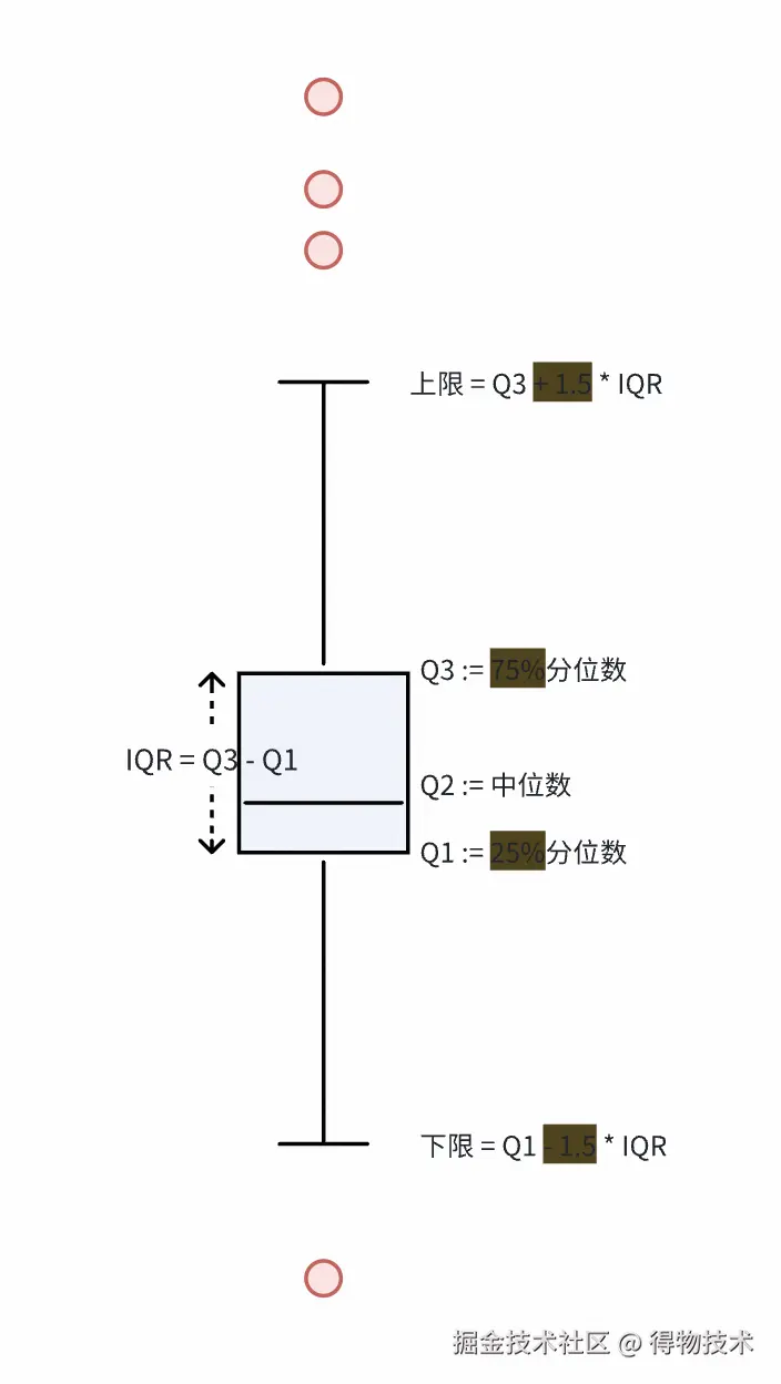 - IQR异常检测是指:超过上四分位数1.5倍的IQR,或低于下四分位数1.5倍的IQR,则为异常。