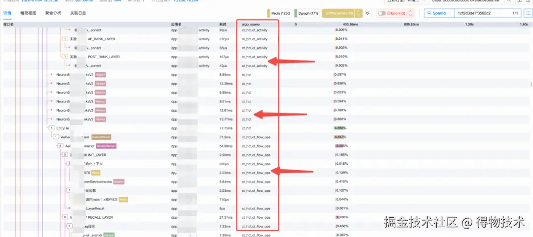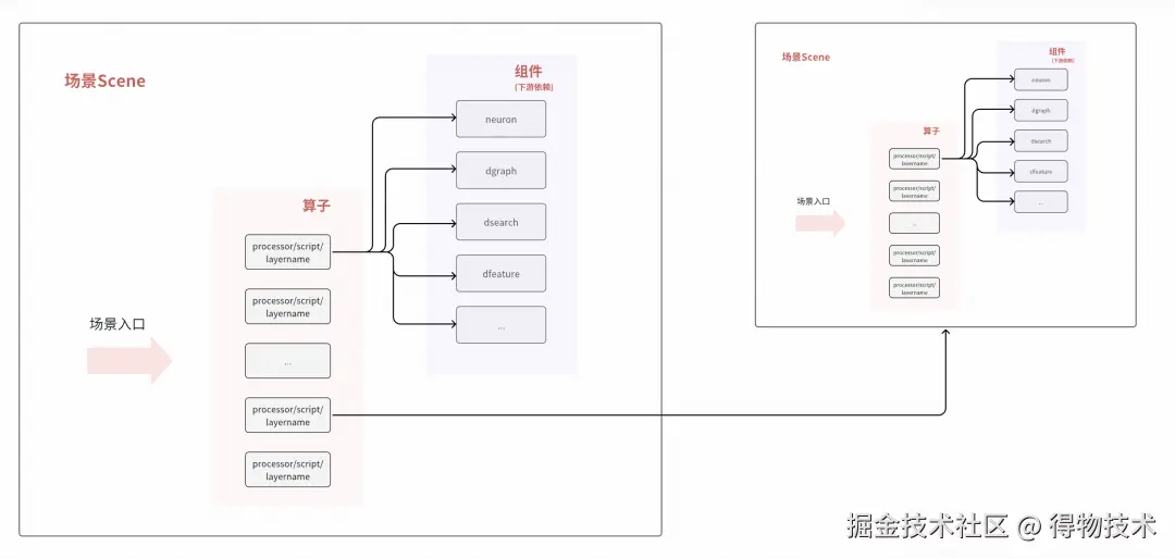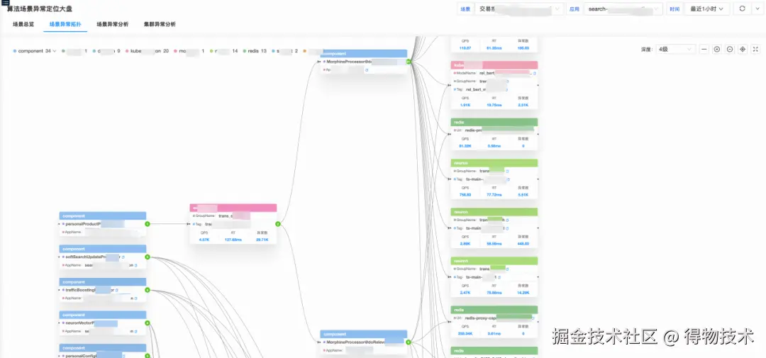 在得物APP中,用户每一次搜索或进入社区频道,底层都会触发一次复杂的RPC调用流。流量在算法域内穿梭时,会经历多次不同“场景”算子的串行与并行计算,最终才将推荐结果反馈给客户端。正是由于这种调用路径极其复杂且具备高度的业务特性,我们决定打破传统的物理链路视角,转而以 “场景”为核心单元构建知识图谱。