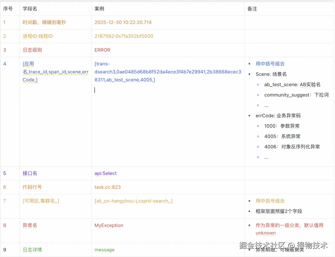 - 业务语义锚定:在日志规范中首次引入了“场景 (Scene) + 异常码 (Error Code)”。