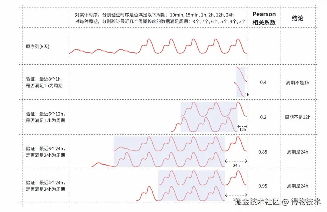 给定一些候选周期,通过计算时间序列的滞后1周期的自相关性,验证时间序列是否匹配候选周期。对不同的候选周期,取不同长度的历史数据,候选周期越大,需要历史数据越久远,相关性要求较低。