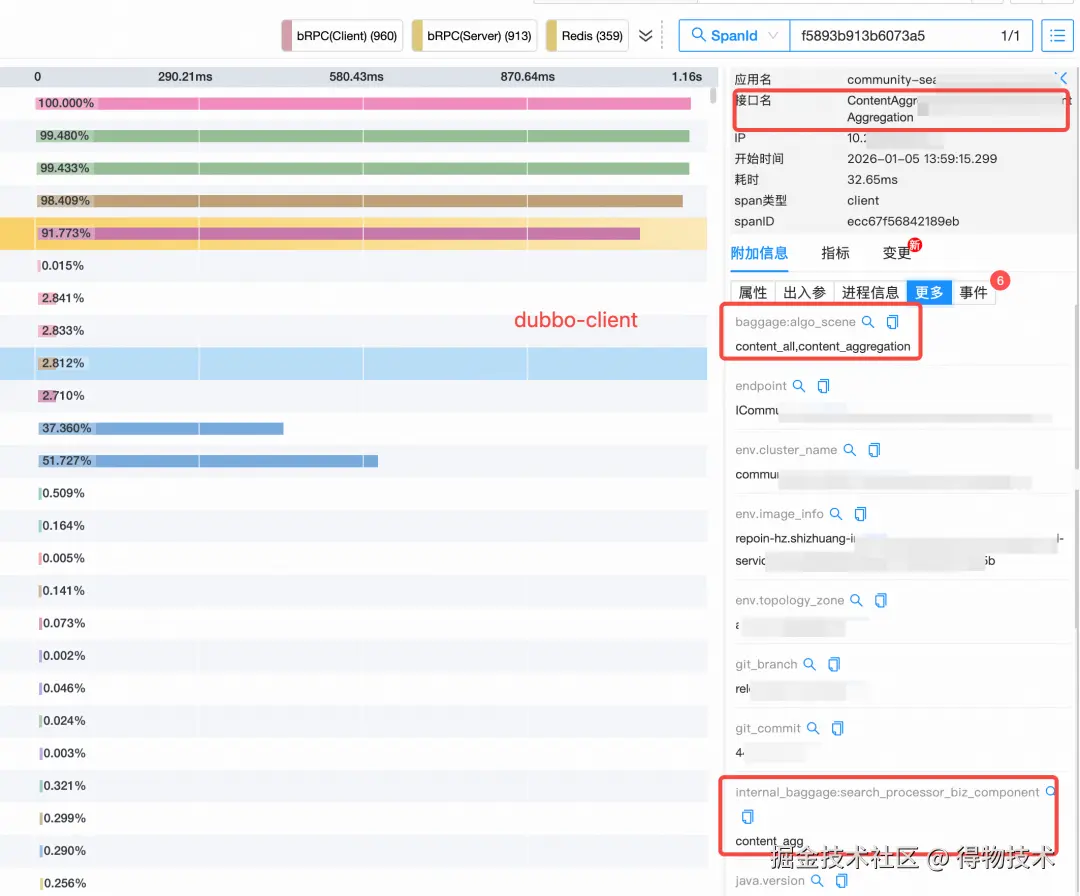 - Trace为径: 超越单纯的拓扑记录。通过Baggage机制,将复杂的业务语义与算法策略注入链路,实现调用流与业务流的深度耦合。