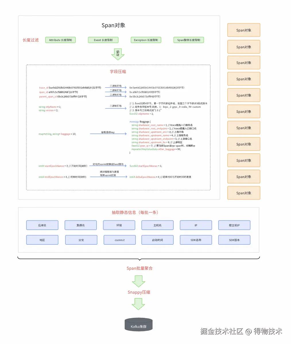 静态信息抽取: 对进程级别的静态信息从Span对象中剥离,每个聚合报文只添加一个静态信息副本。