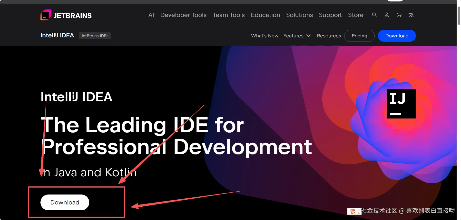 现在开始idea下载安装的第一步。官网下载虽然慢点,但确保是最新版本。