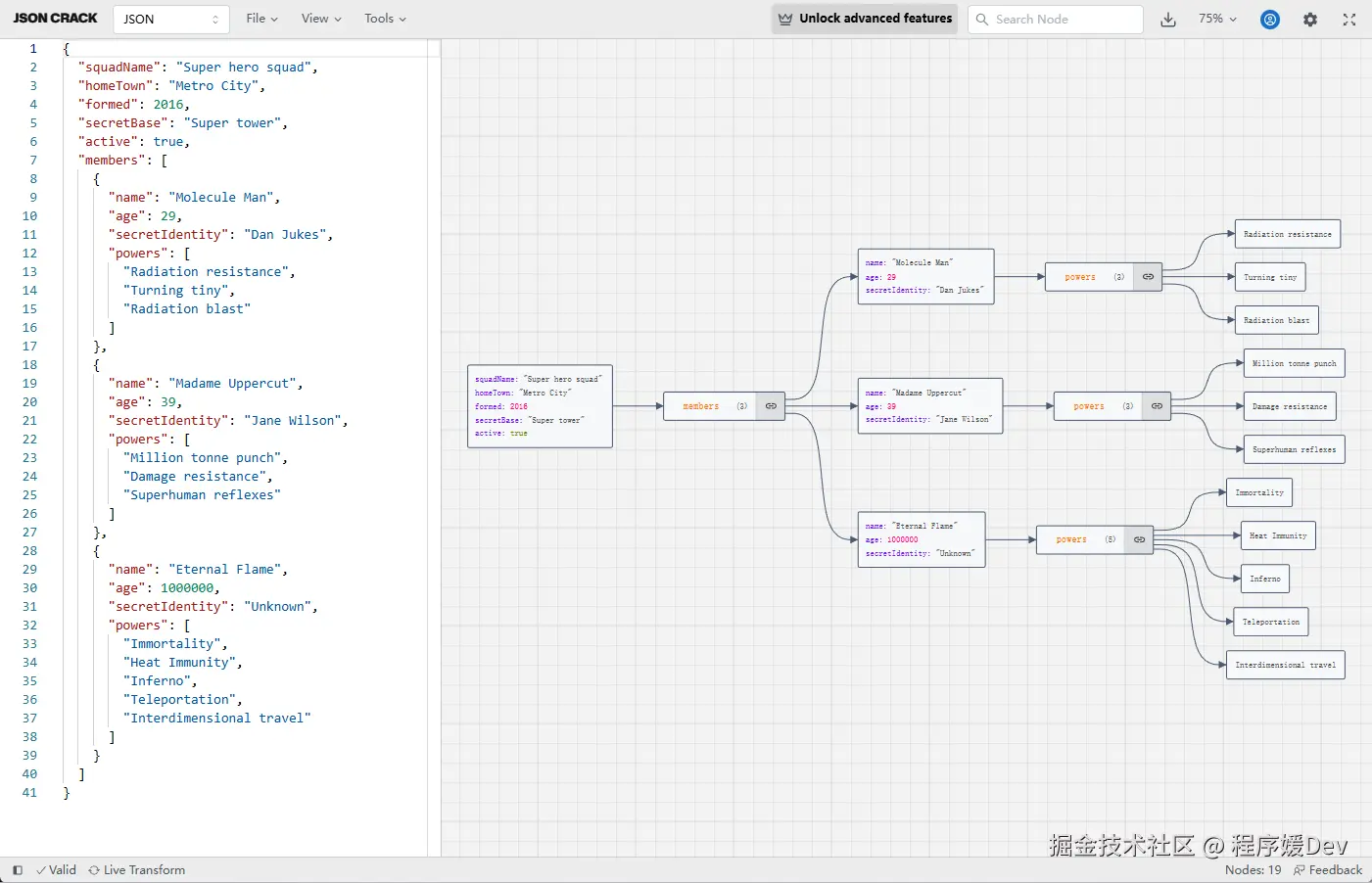 功夫不负有心人,我找到了 JsonCrack 这个神器。它在 GitHub 上狂揽 29.3k Star,能够将任何 JSON 数据一键转换成精美的关系图谱。