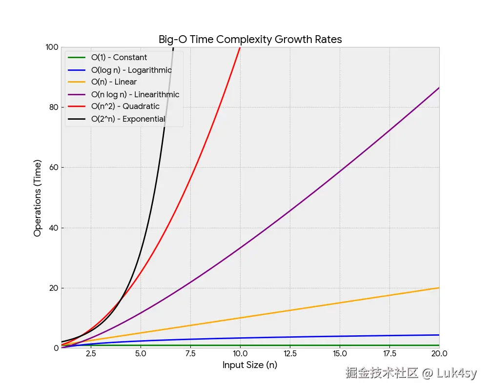 通过上面的两个例子,我们就可以引出时间复杂度了,大 O。时间复杂度通常用大写的 O 来表示,它是一个函数,是一个用来描述算法运行时间在输入规模趋向无穷大时,其增长率的“渐近上界”(即最坏情况下的天花板)的数学记号,“渐近”的意思就表示这个函数不包括低阶项和首项系数,“上界”则表示这个算法的最坏情况也就是表示性能的天花板了。大 O 是一个函数而不是具体时间是因为其实代码的运行时间不单单跟算法的本身有关系,我们还得考虑具体的数据量以及机器的性能。 所以上面两个例子的大 O 分别,O1 = n,O2 = n²,分别表示 O(n) 和 O(n²) 。