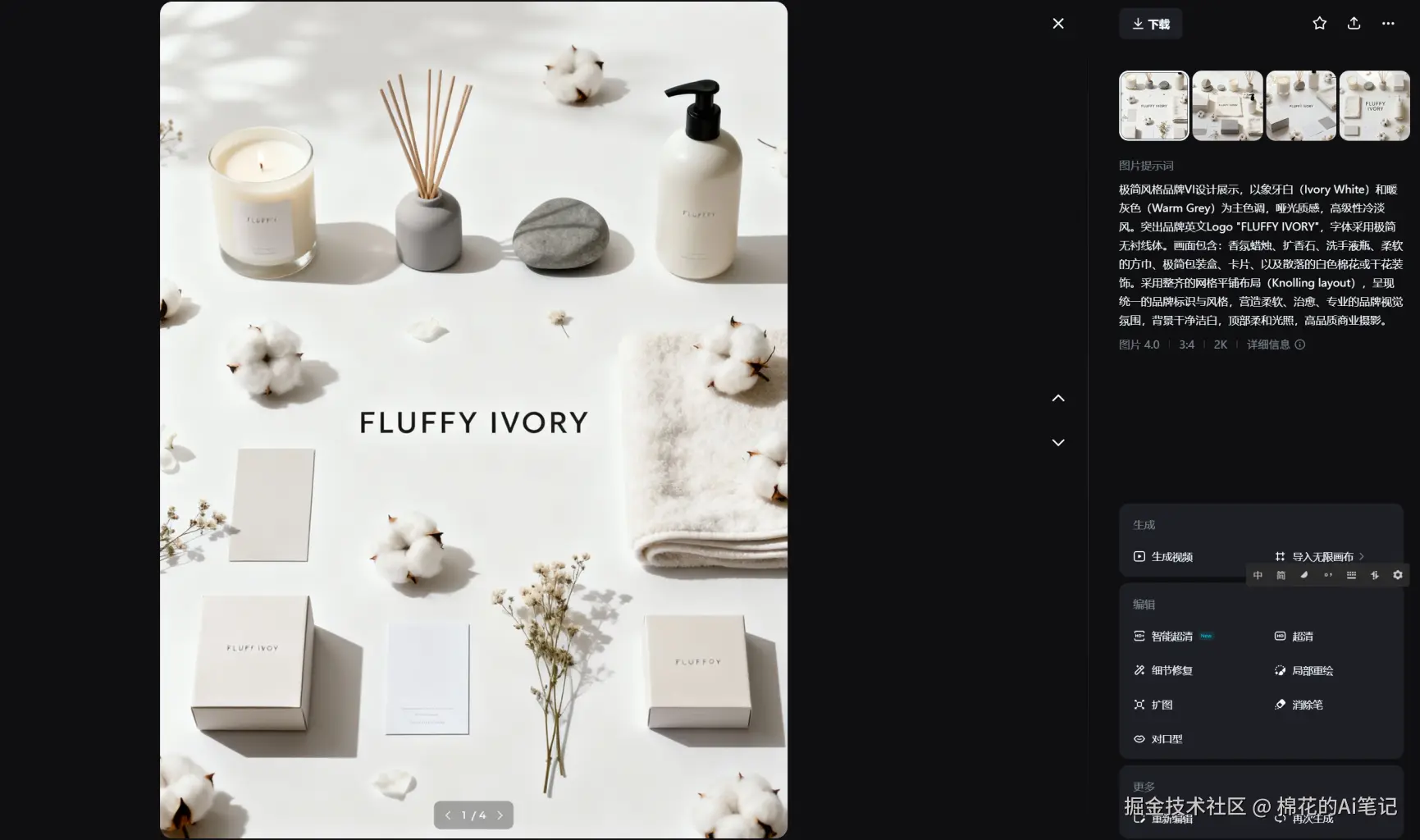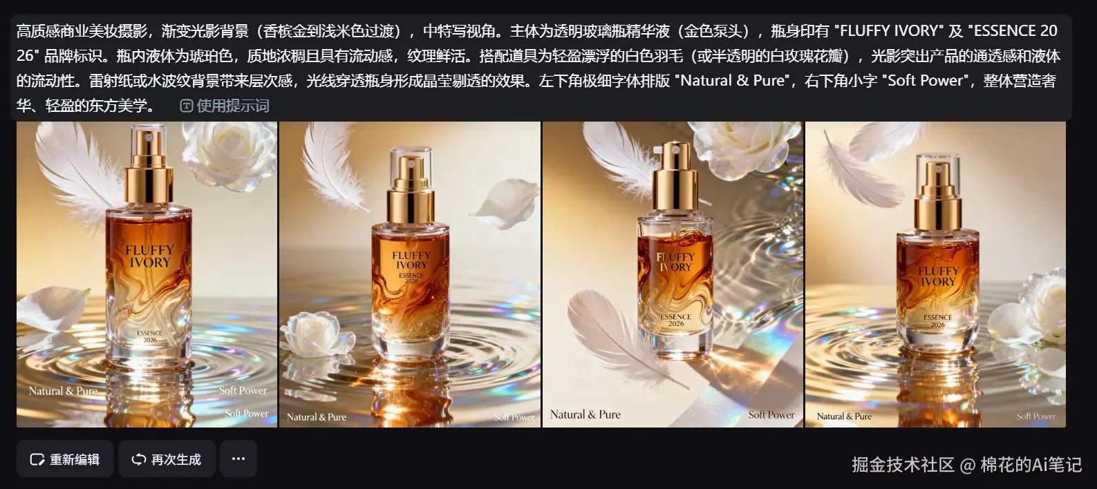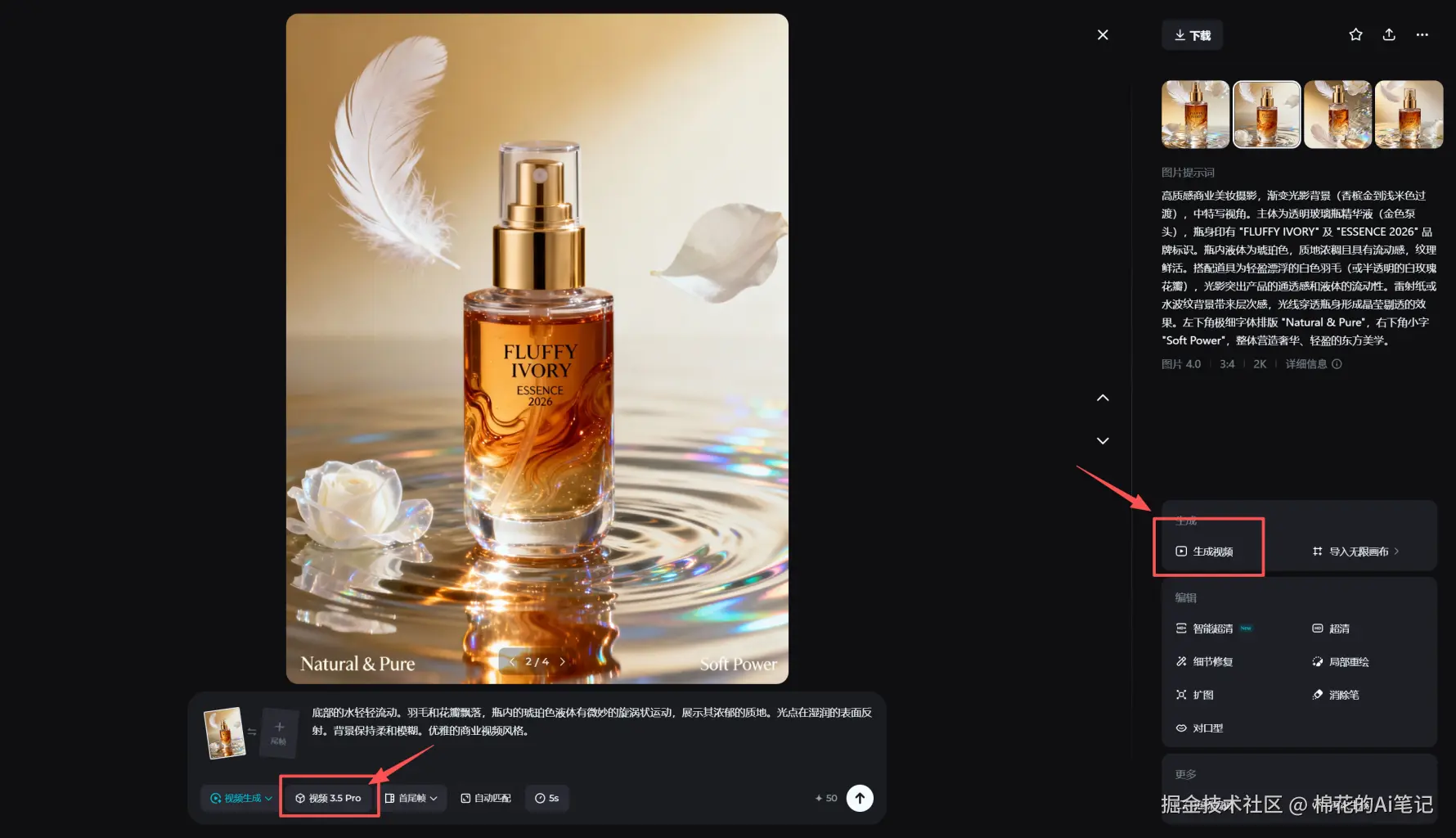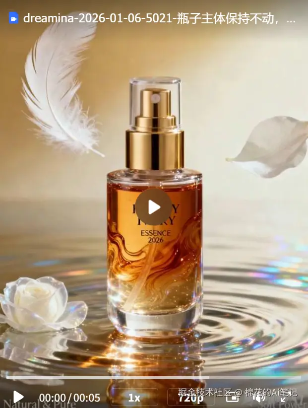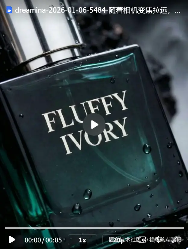 在商业视频制作中,流体(水、烟雾)的自然度是检验AI模型物理理解力的试金石。我们以一款“FLUFFY IVORY”香水产品为例,测试即梦视频 S3.5 Pro 的“图生视频”能力。