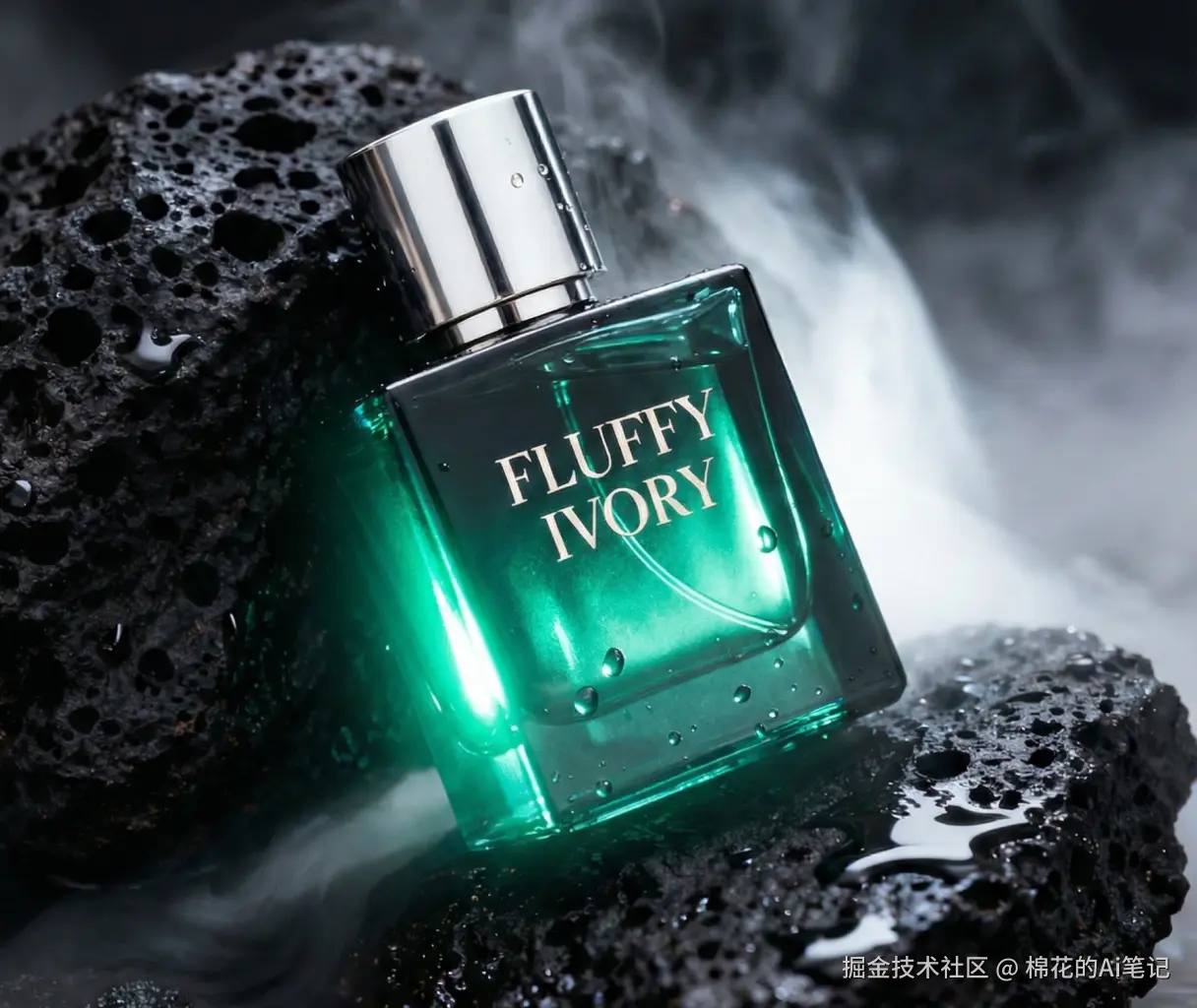 测试素材: 一张绿色的“FLUFFY IVORY”香水产品图,背景是黑色多孔岩石。