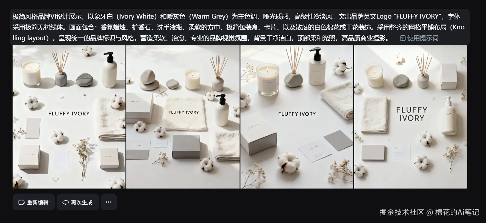 结果分析: 即梦AI在处理多物体组合时,保持了极高的光影逻辑统一性。画面中的象牙白与暖灰色调(Warm Grey)高度和谐,没有出现色偏或物体结构混乱的情况。这证明了其在全案策划和Moodboard制作阶段的可用性。