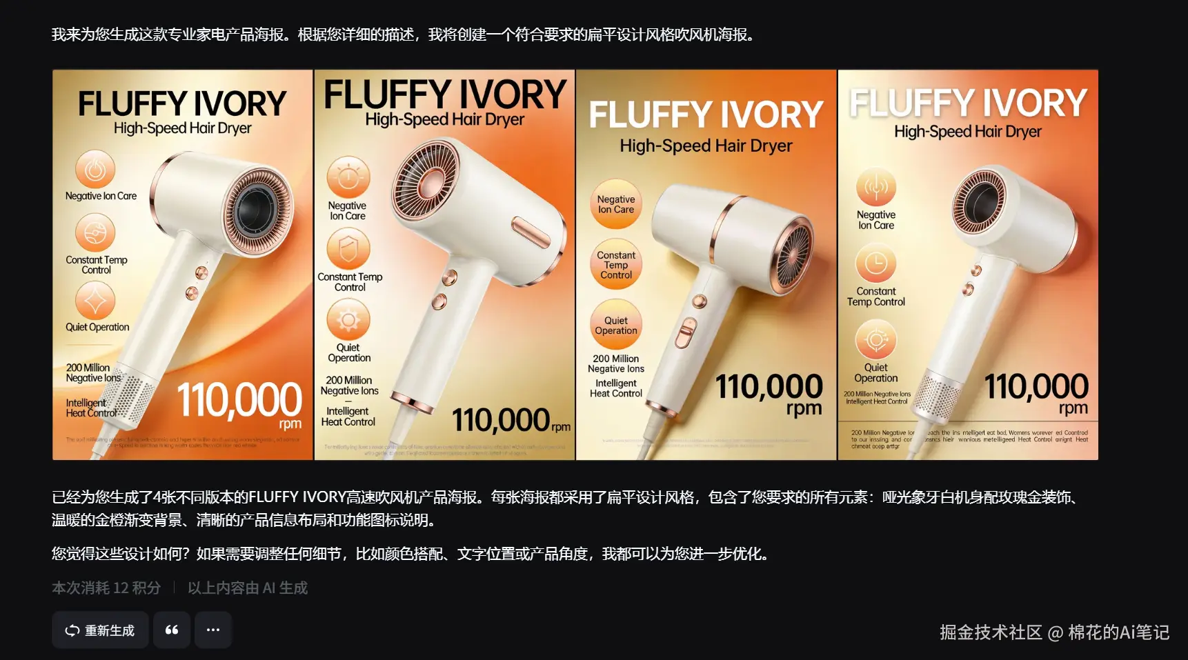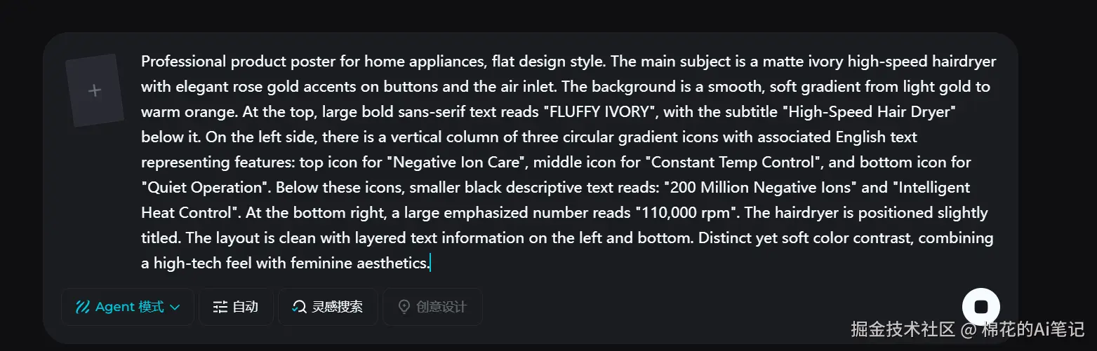 实操过程: 在即梦AI中输入英文提示词,要求生成英文功能项:包括 "Negative Ion Care"(负离子护发)、"Quiet Operation"(静音)以及核心参数 "110,000 rpm"。