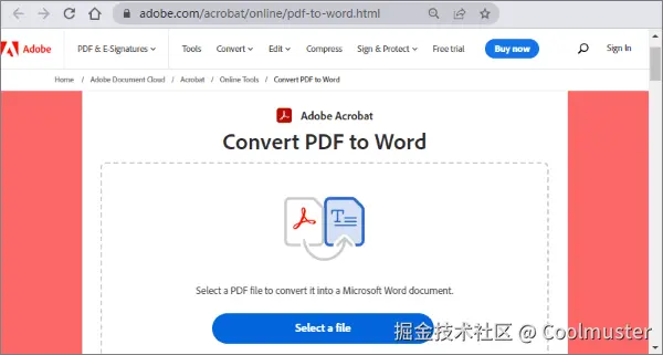 第 1 步:转到Adobe Acrobat在线 PDF 到 Word 转换页面。