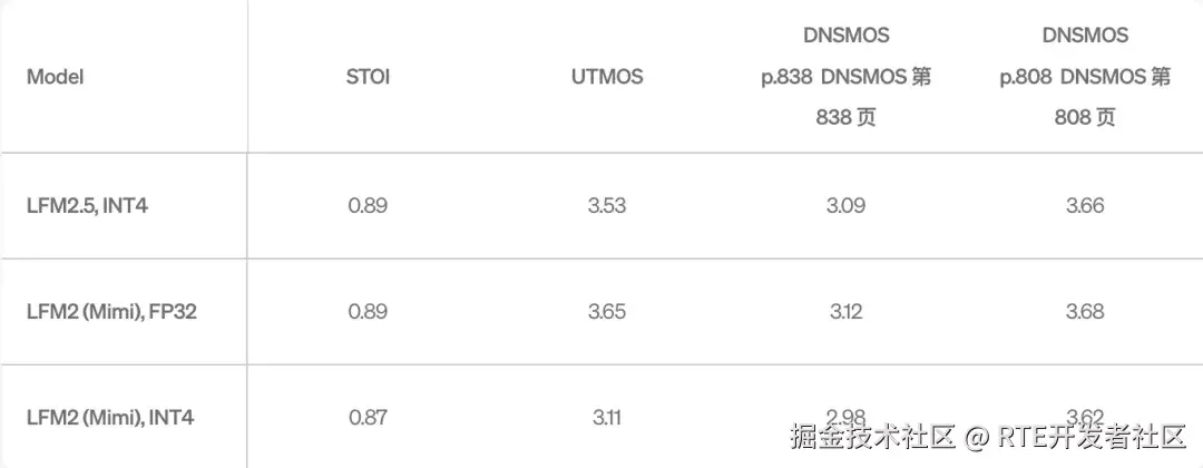 LFM 音频解码器提速 800%:内置基于 LFM 架构的新型紧凑型音频解码器。在相同精度的移动 CPU 环境下,其解码速度较 LFM2 提升了 8 倍。同时,该模型通过了量化感知训练,在 INT4 精度下部署时几乎无音质损失。