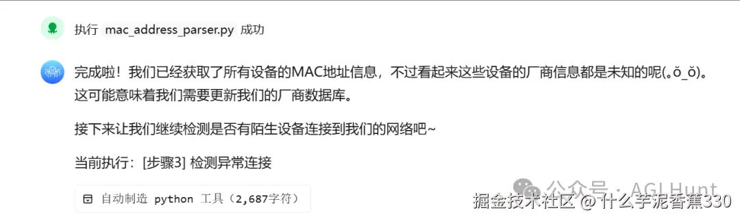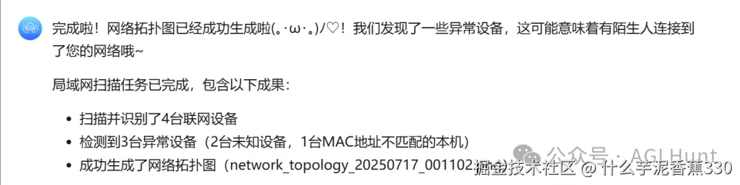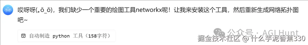 ModuleNotFoundError 后就崩溃退出了。而是它发现自己失败了,并还诊断出了失败的原因(缺少networkx库),并立刻提出了解决方案:****安装它!它甚至没有问我该怎么办,就直接给出了行动计划,然后自动执行安装命令、成功安装了networtx 库之后,它再次尝试生成拓扑图。这一次,一切顺利。最后它给出了详尽的总结报告:虽说展示上不够精美高大上,但胜在一目了然: