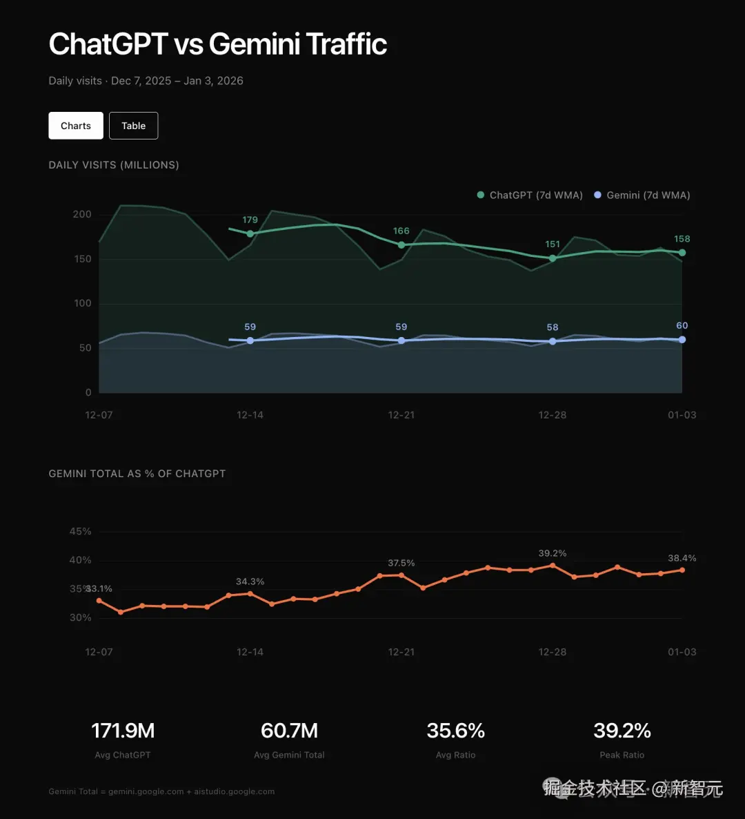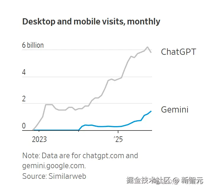 这就意味着,Gemini 正在经历一个典型的「追赶爆发期」,而 ChatGPT 的增速已经在放缓。