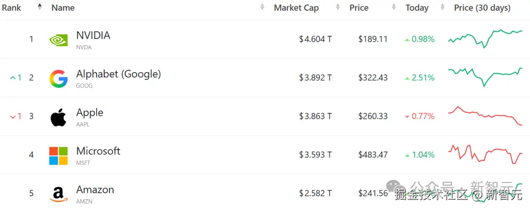 Alphabet 当前市值约为 3.885 万亿美元,略高于苹果的 3.846 万亿美元。而英伟达依然以 4.595 万亿美元的市值遥遥领先,稳居全球第一。
