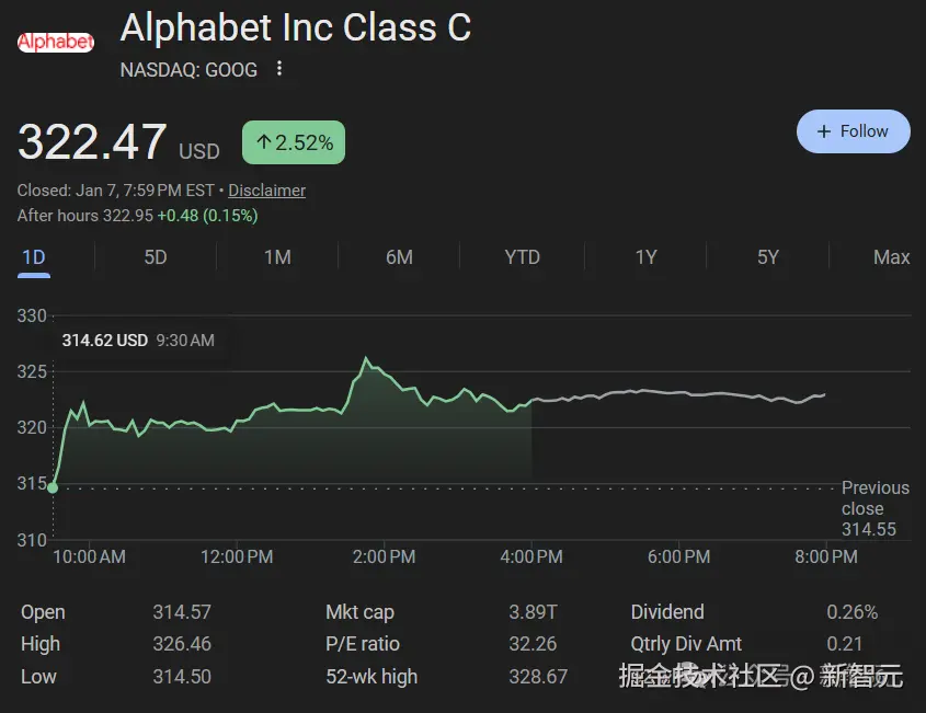 2025 年,谷歌股价累计上涨了 65%,成为大型科技股中表现最好的公司;今年以来,它股价又继续上涨了 2.9%。